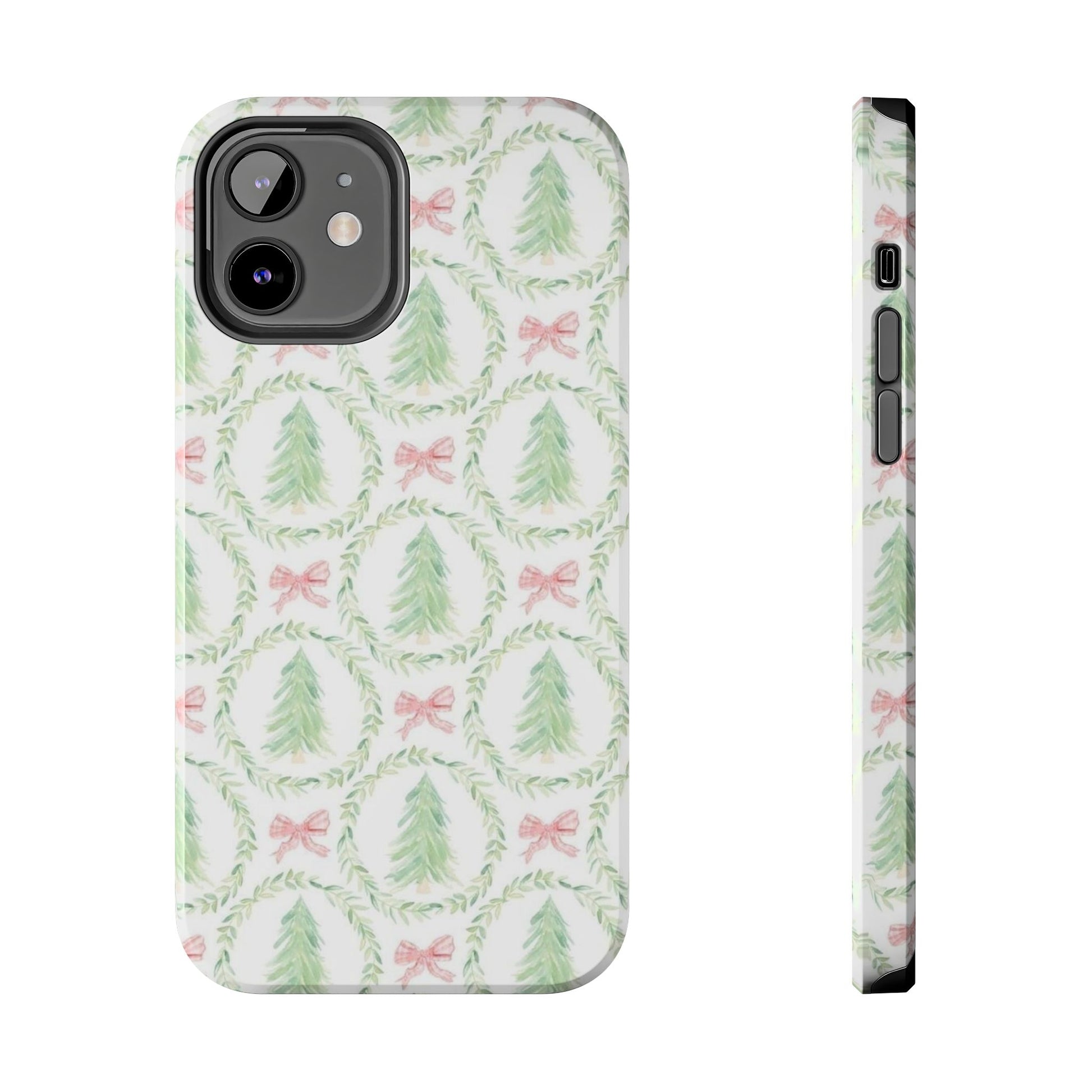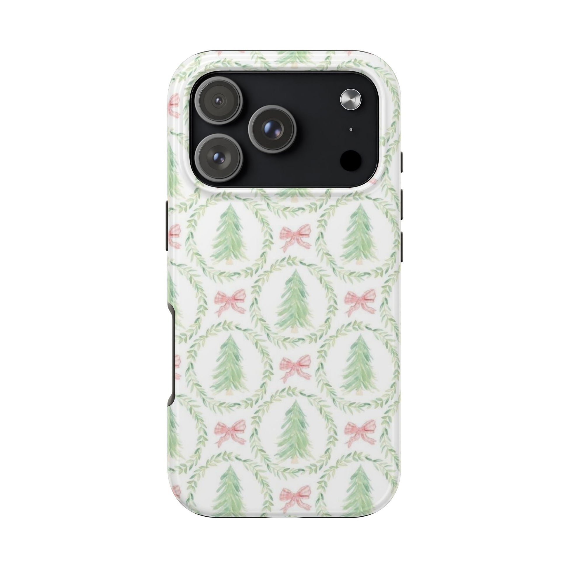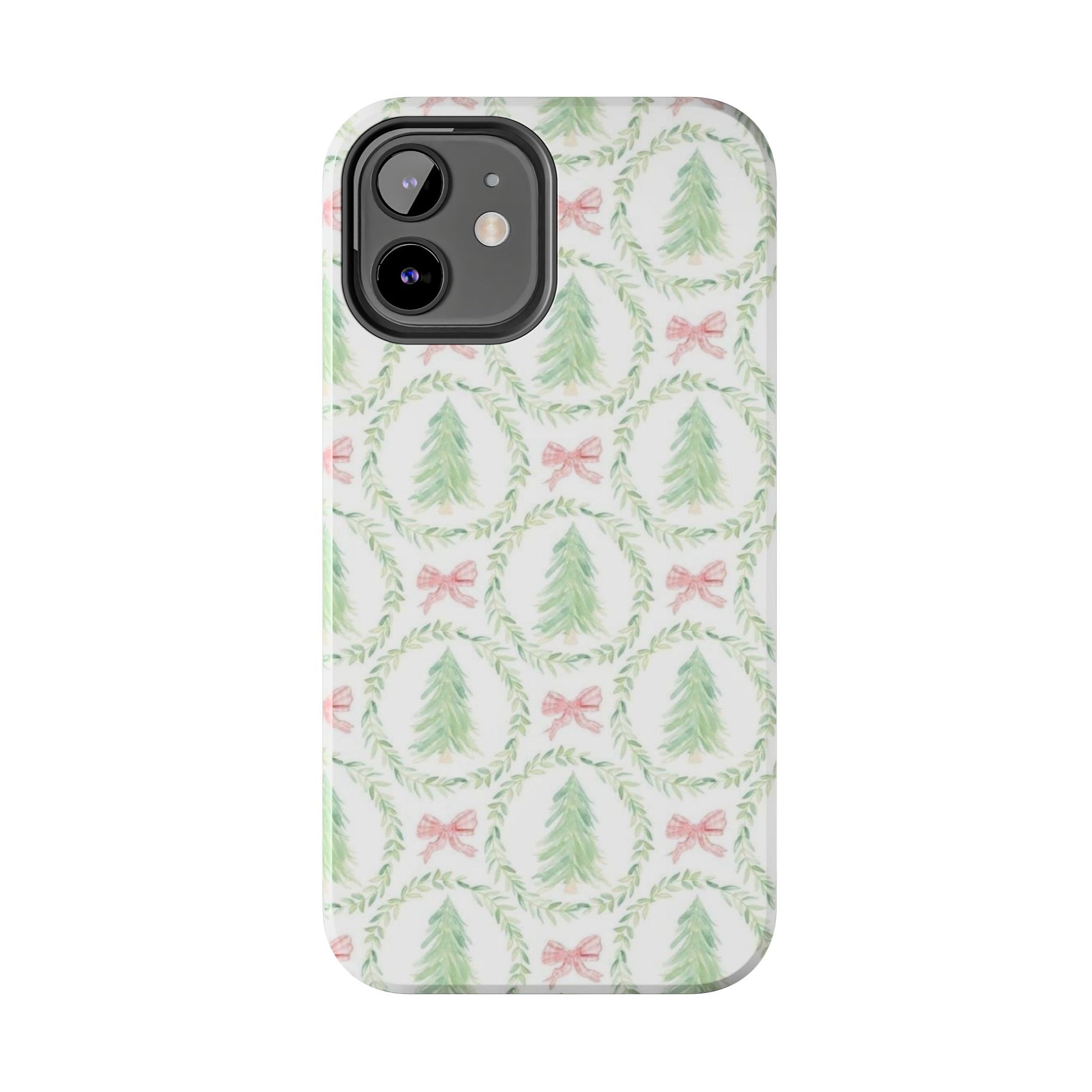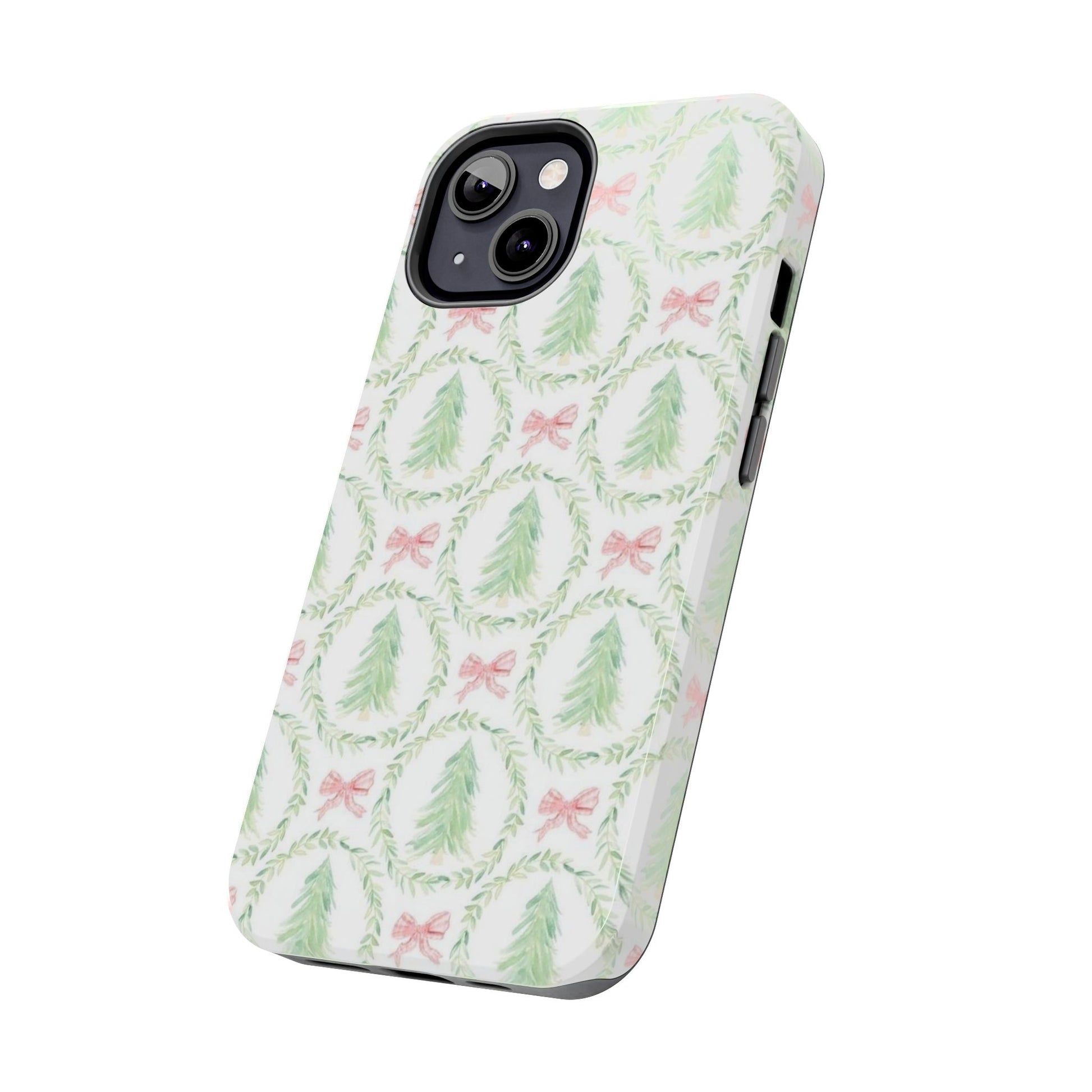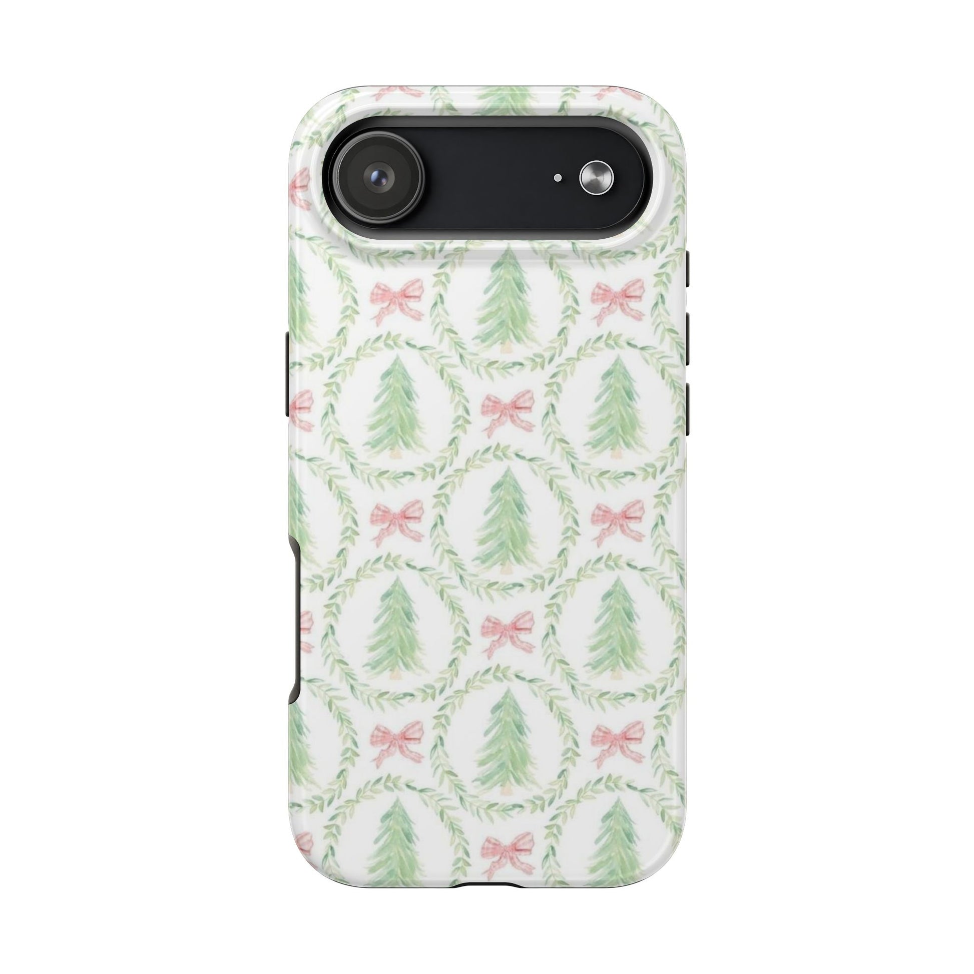 A slim, glossy phone case that brings a soft, wintry charm to your daily carry. Pale watercolor evergreens nested inside delicate laurel wreaths and tiny pink bows give the case a gentle, vintage holiday feel without shouting. The two-piece construction pairs a tough polycarbonate shell with a flexible TPU liner to soak up knocks and drops, while the lay-flat bezel keeps your screen off rough surfaces. UV protection preserves the muted greens and blush tones, so the pattern stays fresh through seasons of use. Lightweight and wireless-charging compatible, this case slips into a tote or pocket and adds a quiet, cozy accent to your everyday routine or seasonal outings.
