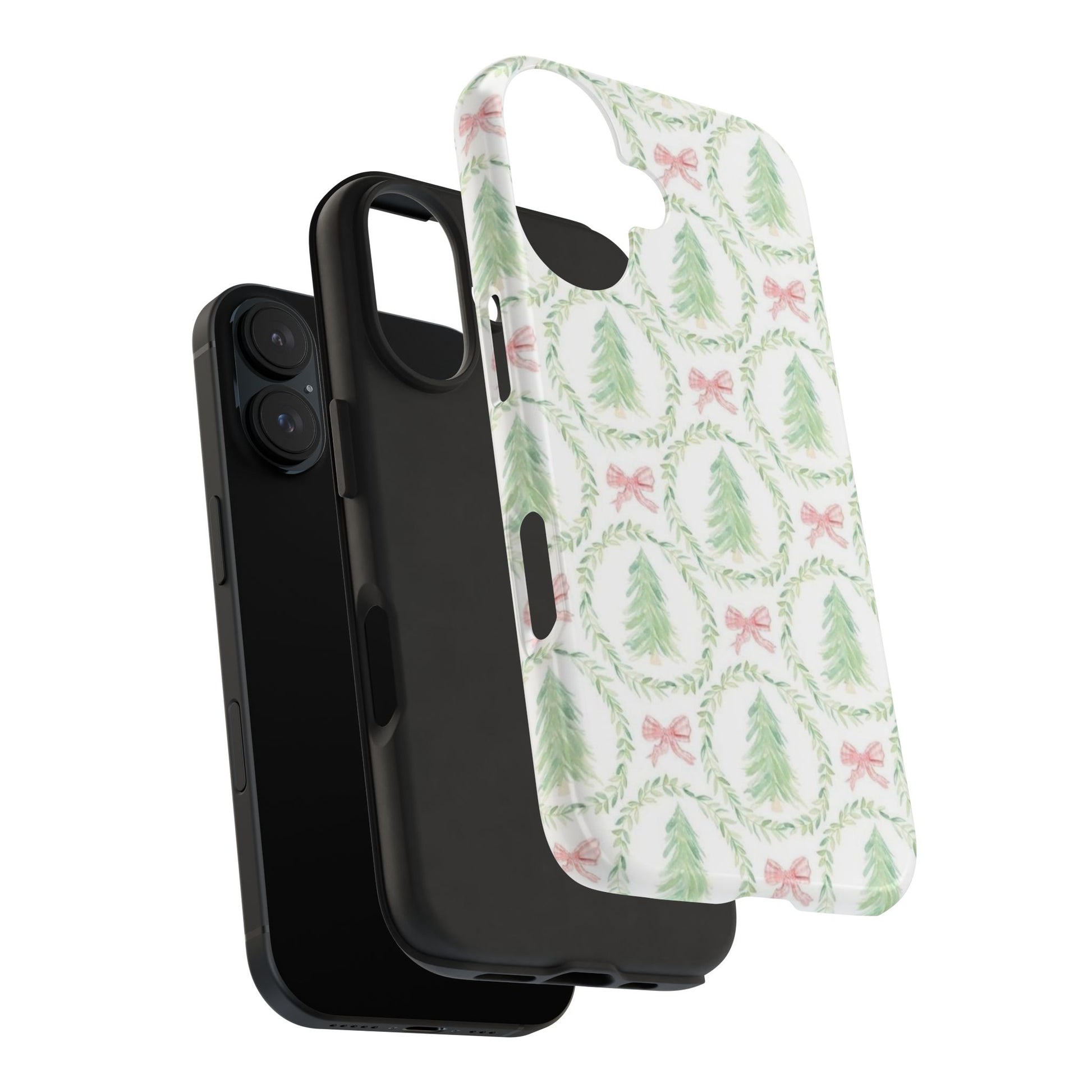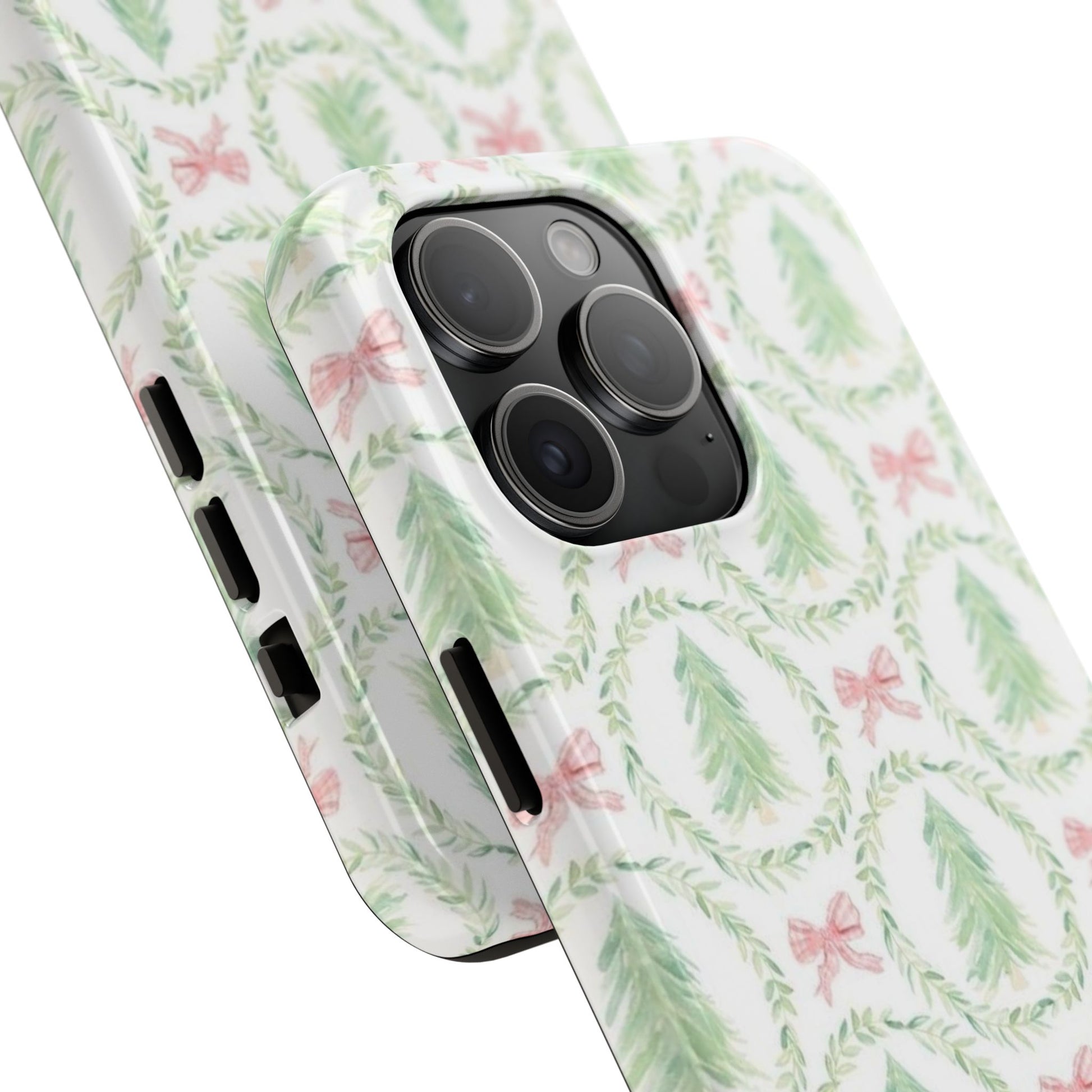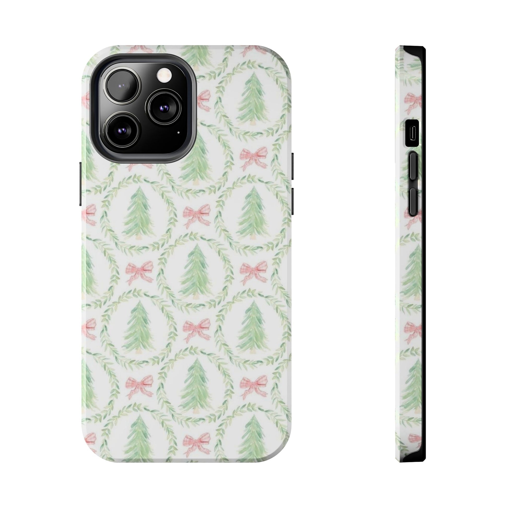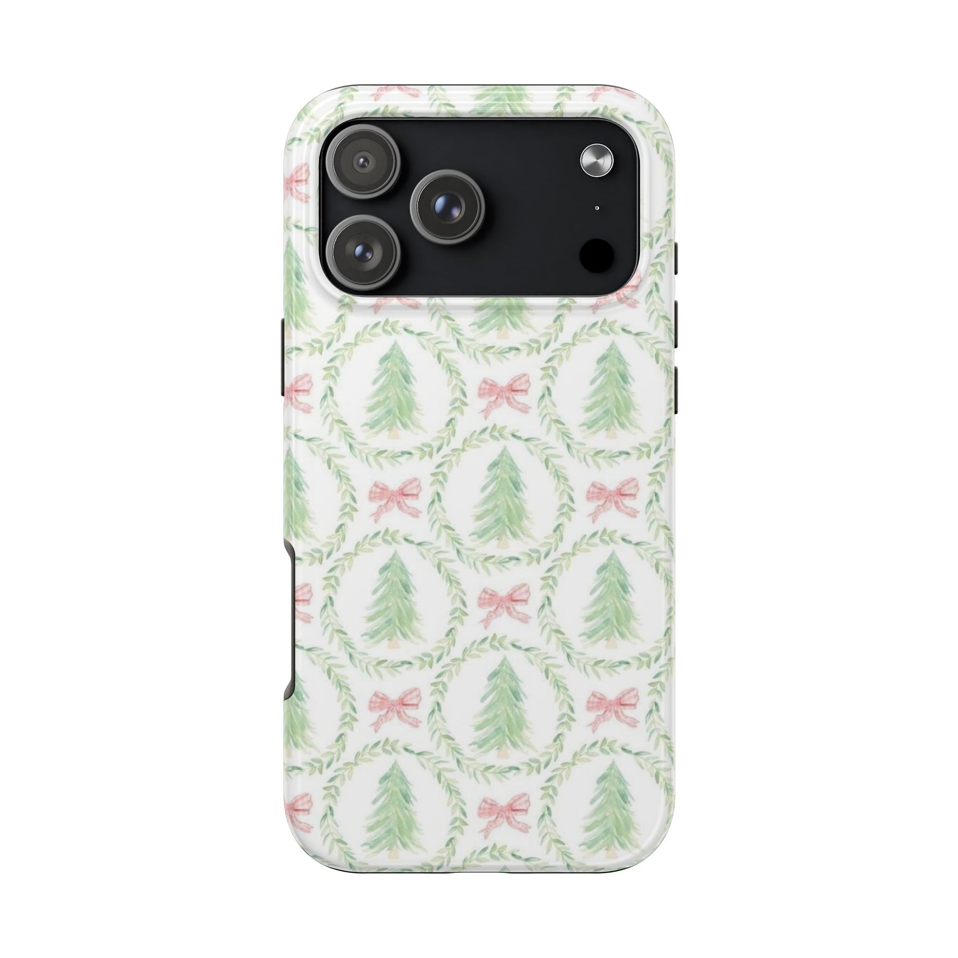 A slim, glossy phone case that brings a soft, wintry charm to your daily carry. Pale watercolor evergreens nested inside delicate laurel wreaths and tiny pink bows give the case a gentle, vintage holiday feel without shouting. The two-piece construction pairs a tough polycarbonate shell with a flexible TPU liner to soak up knocks and drops, while the lay-flat bezel keeps your screen off rough surfaces. UV protection preserves the muted greens and blush tones, so the pattern stays fresh through seasons of use. Lightweight and wireless-charging compatible, this case slips into a tote or pocket and adds a quiet, cozy accent to your everyday routine or seasonal outings.