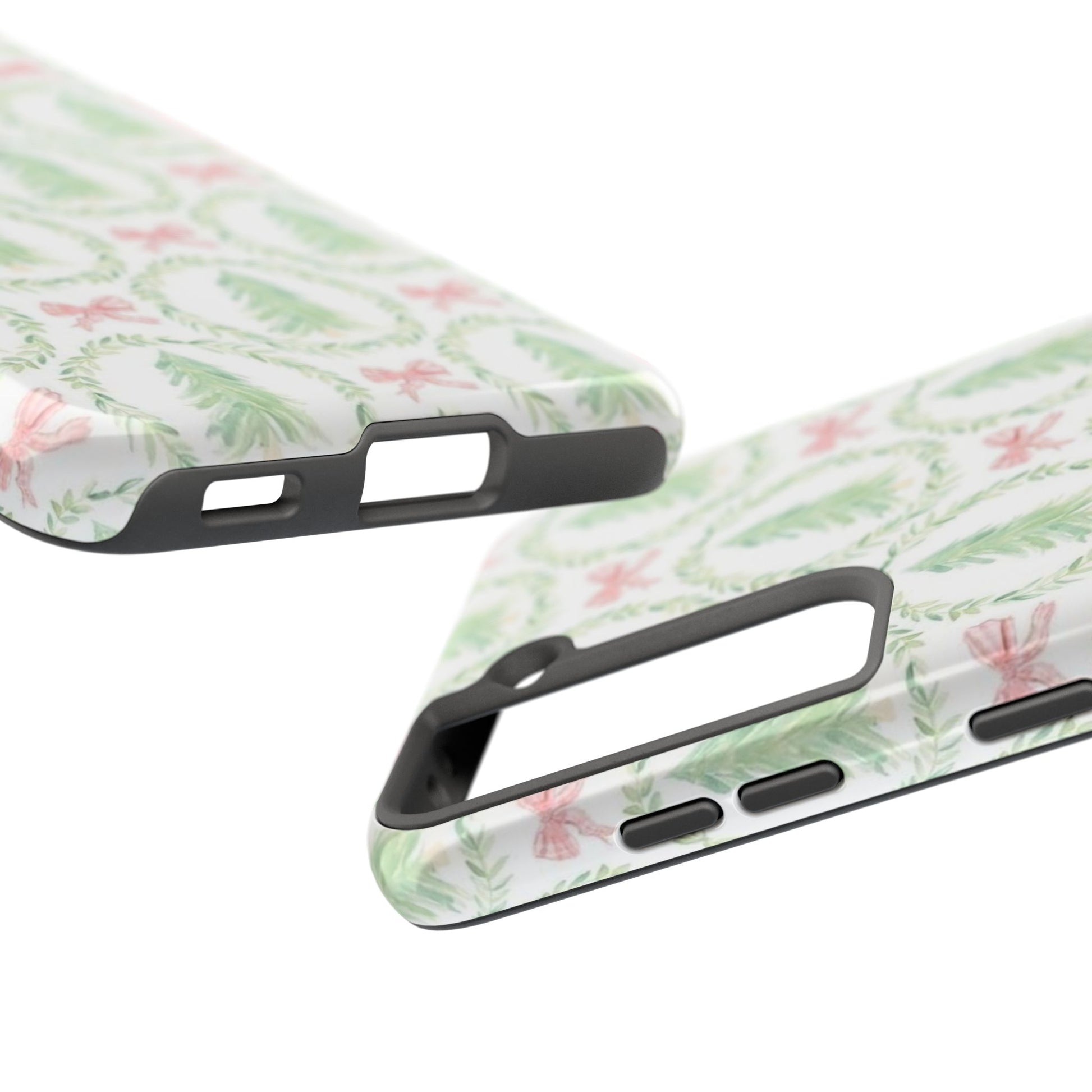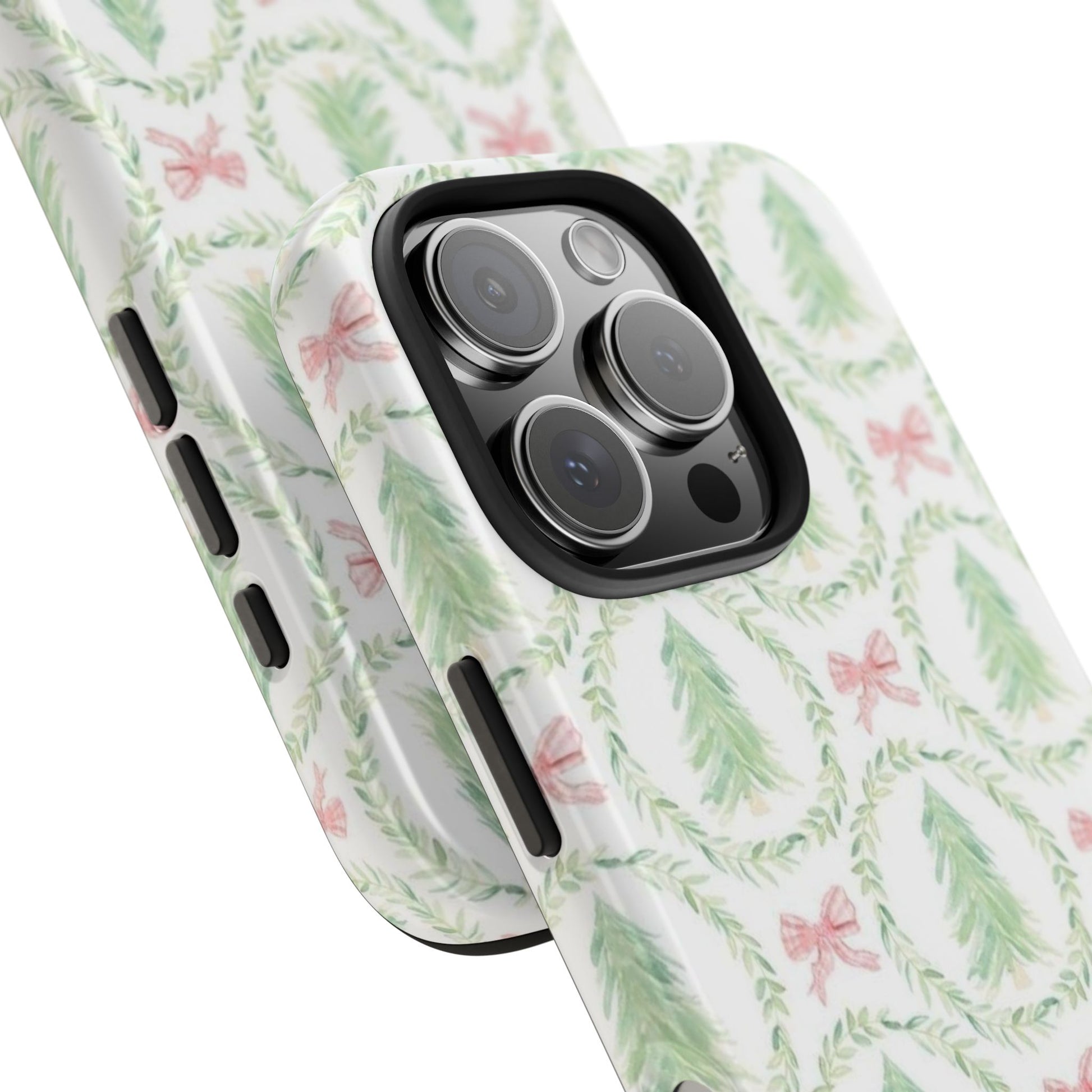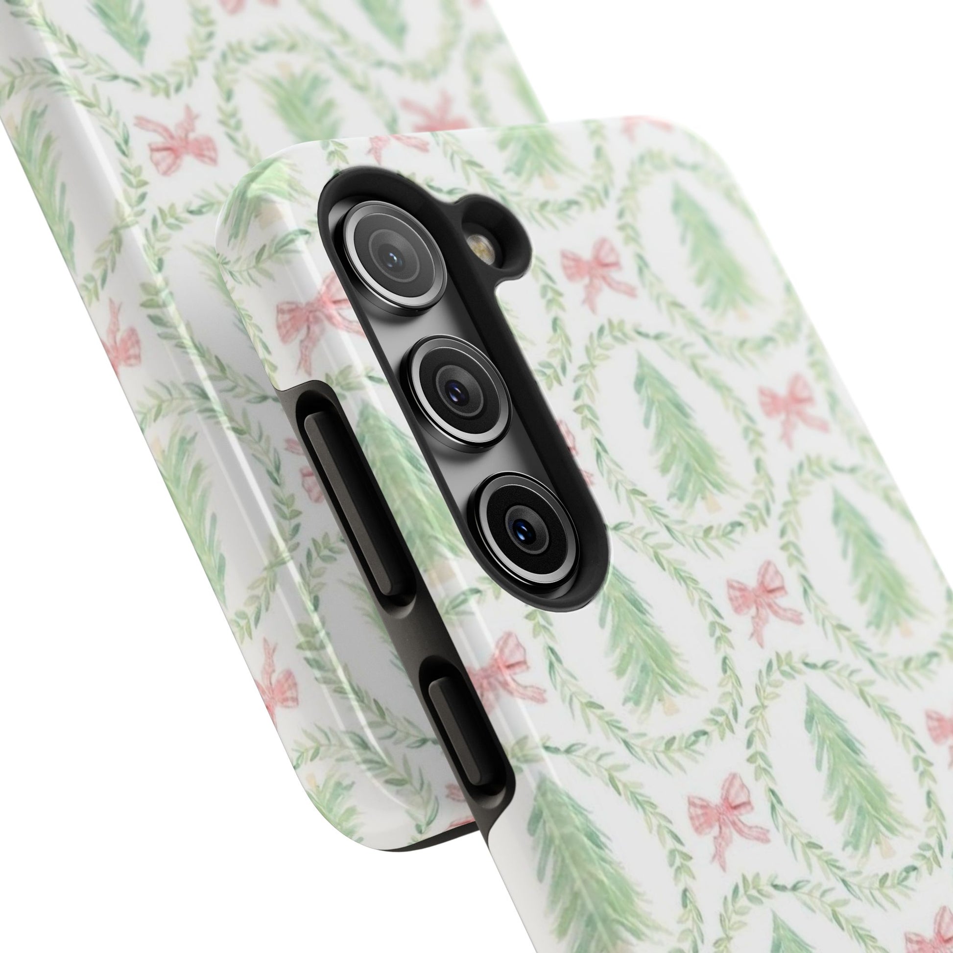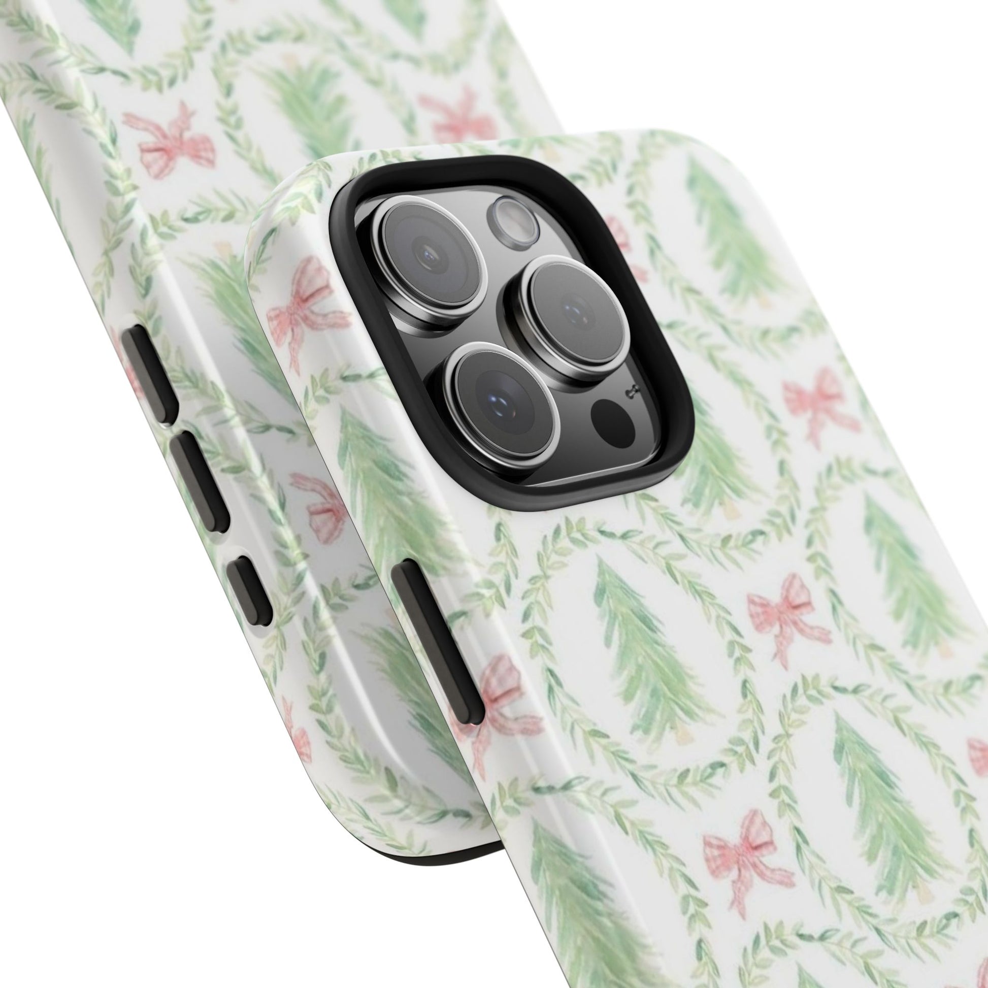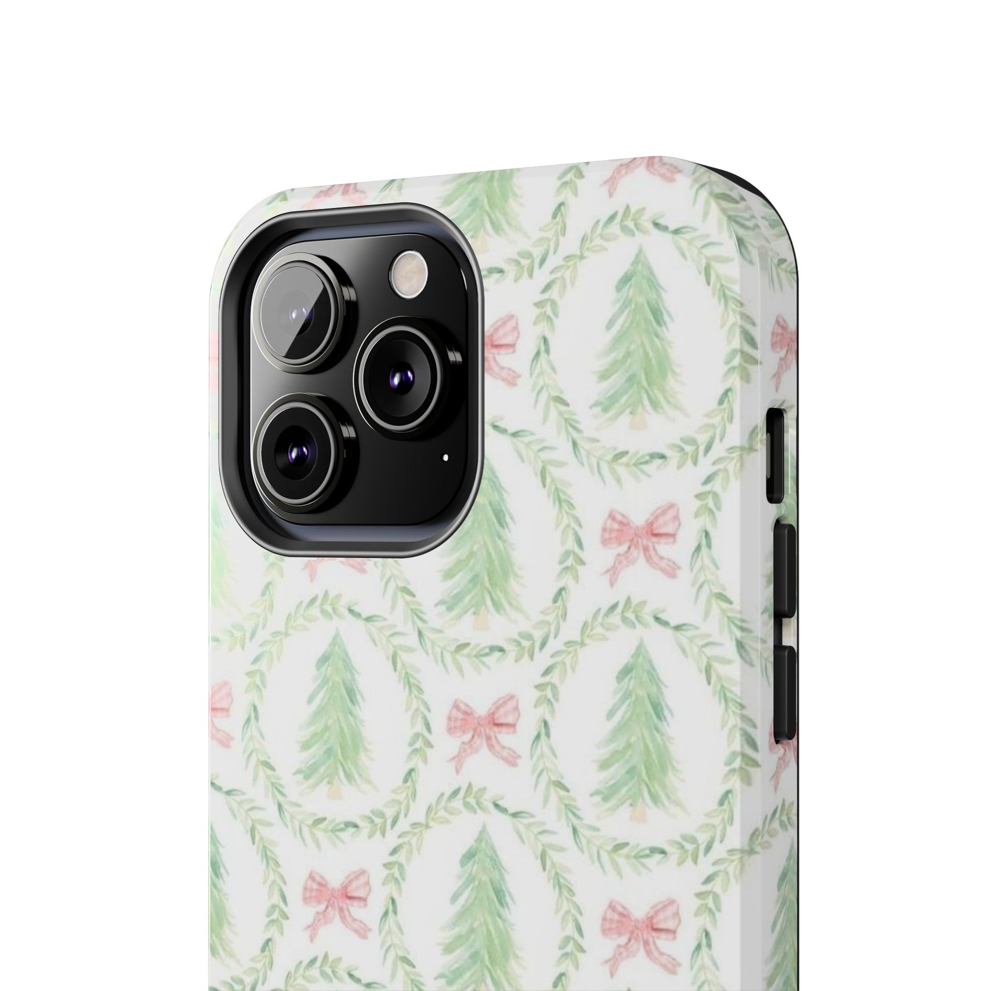 A slim, glossy phone case that brings a soft, wintry charm to your daily carry. Pale watercolor evergreens nested inside delicate laurel wreaths and tiny pink bows give the case a gentle, vintage holiday feel without shouting. The two-piece construction pairs a tough polycarbonate shell with a flexible TPU liner to soak up knocks and drops, while the lay-flat bezel keeps your screen off rough surfaces. UV protection preserves the muted greens and blush tones, so the pattern stays fresh through seasons of use. Lightweight and wireless-charging compatible, this case slips into a tote or pocket and adds a quiet, cozy accent to your everyday routine or seasonal outings.