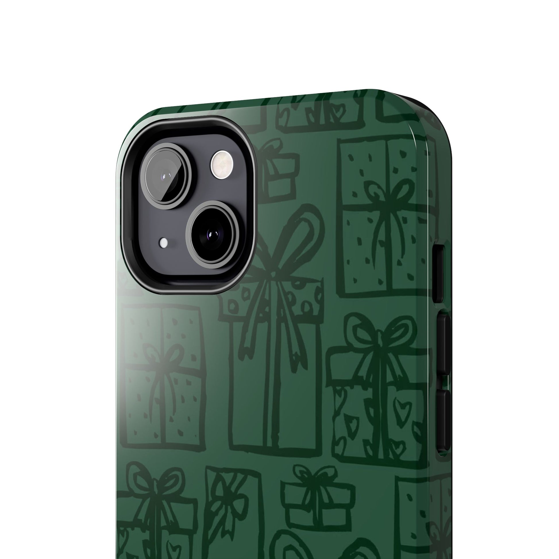 A rich, deep-green phone case patterned with hand-drawn gift boxes — quiet, festive, and slightly whimsical. The glossy finish makes the doodled presents pop while the dual-layer shell and soft rubber liner cushion against drops and daily knocks. Slip it on and your phone looks ready for holiday markets, cozy evenings wrapped in string lights, or those small, thoughtful exchanges of wrapped surprises. It reads like a seasonal accessory that won’t shout; it complements knit sweaters, tote bags, and the ritual of gift-giving without being over the top.