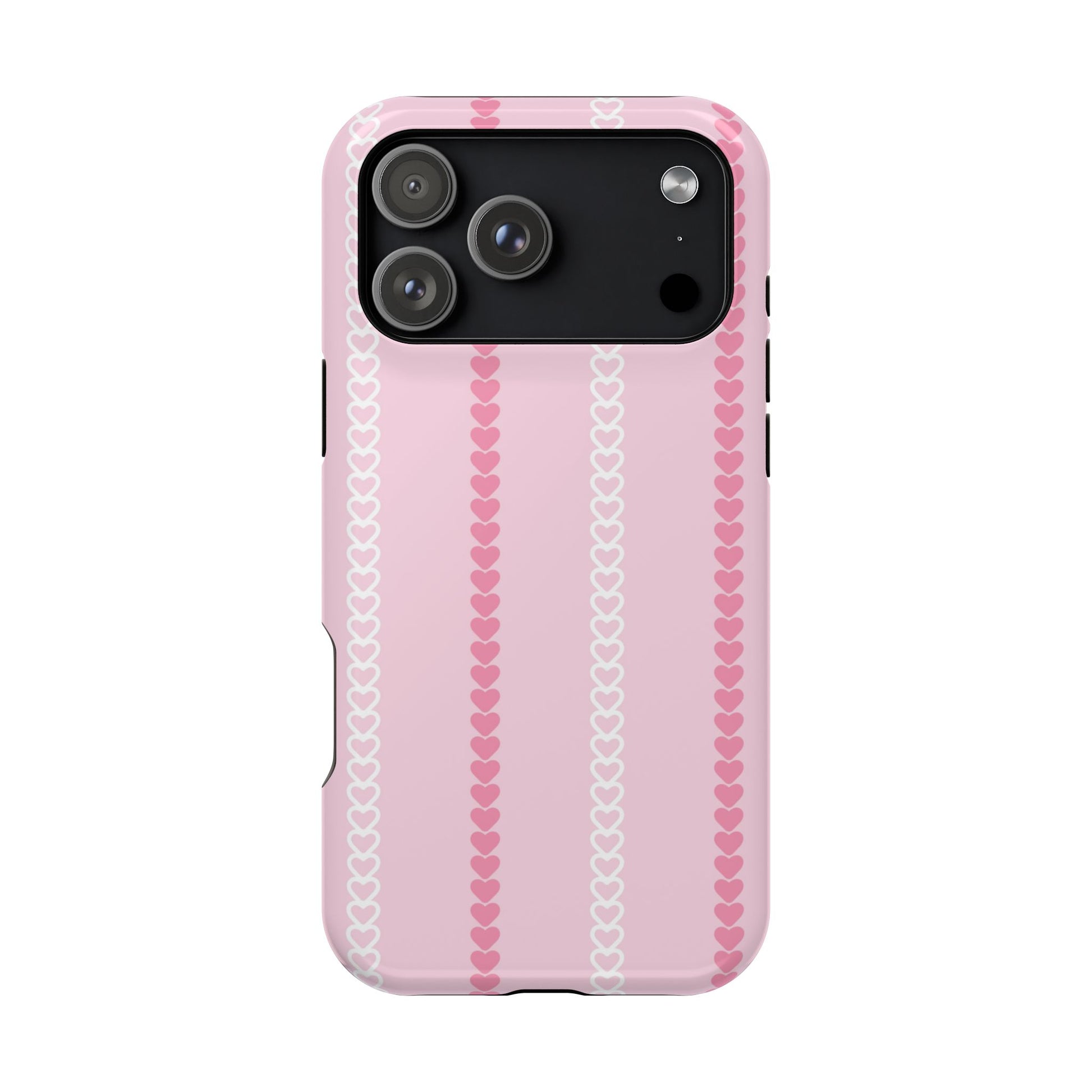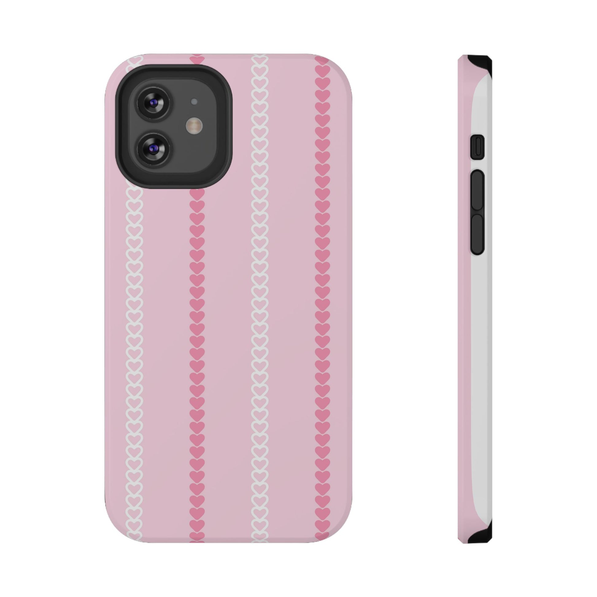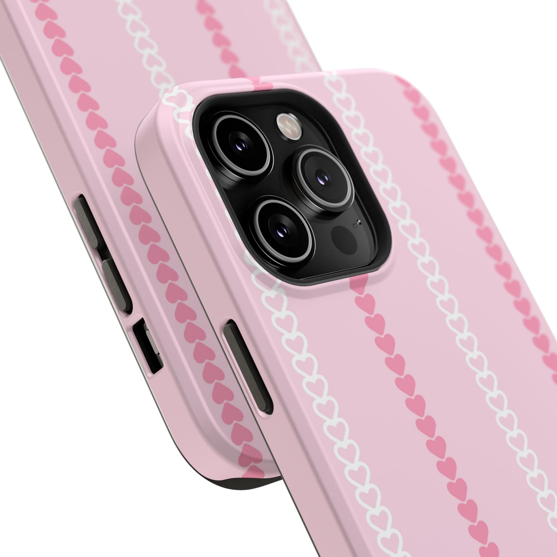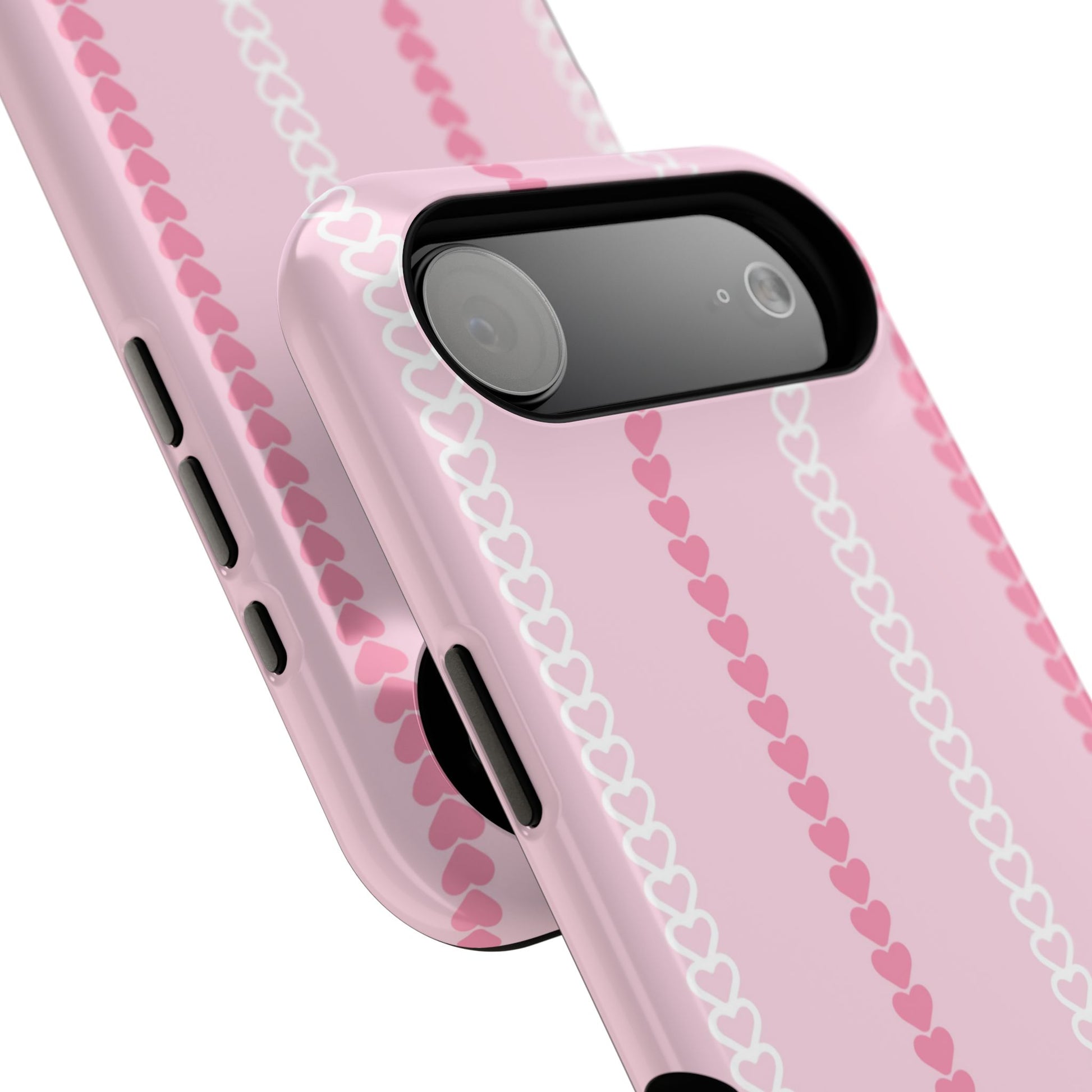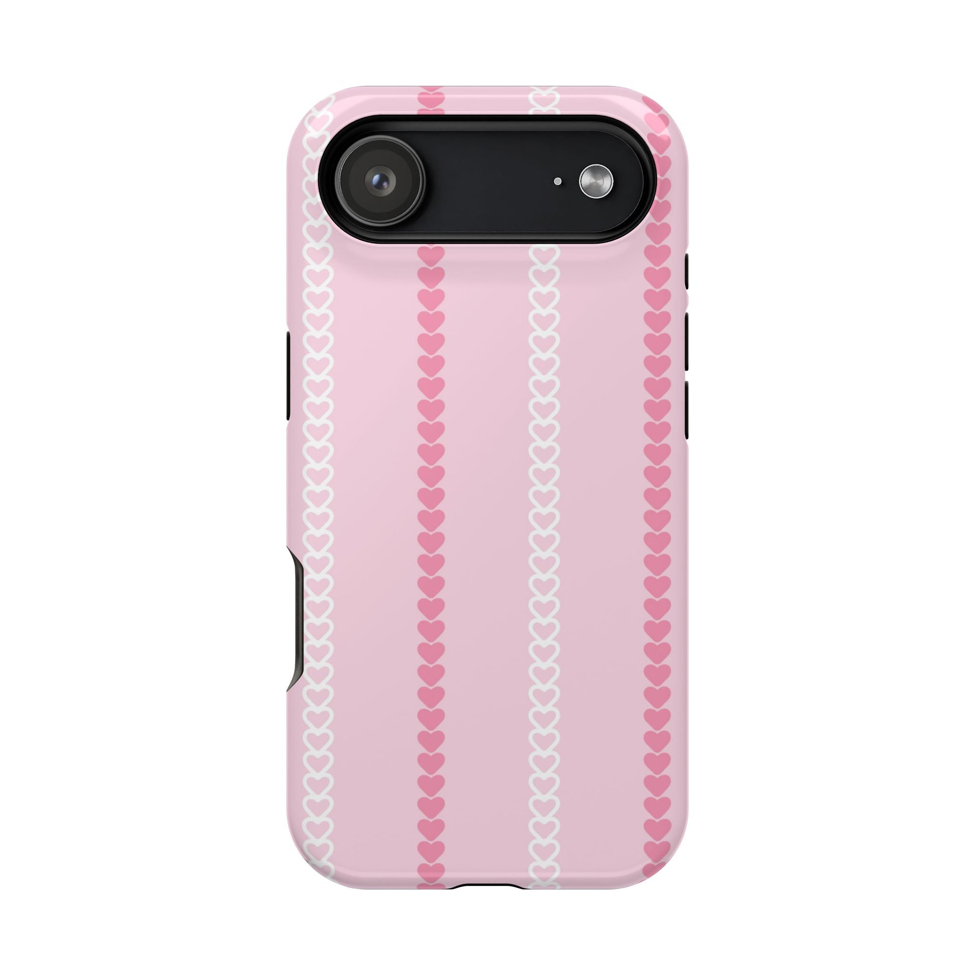 This slim, dual-layer phone case brings a soft, playful vibe to everyday carry. Pale pink stripes of tiny hearts and looping stitches wrap fully around the exterior, turning your phone into a subtle, sweet statement. The rigid polycarbonate outer shell and removable black TPU liner work together to absorb knocks and resist scratches while keeping the design sharp and glossy or gently muted in your choice of finish. It sits comfortably in hand, supports wireless charging, and fits new iPhone 17 series alongside other compatible models — a little everyday charm that protects without adding bulk.
