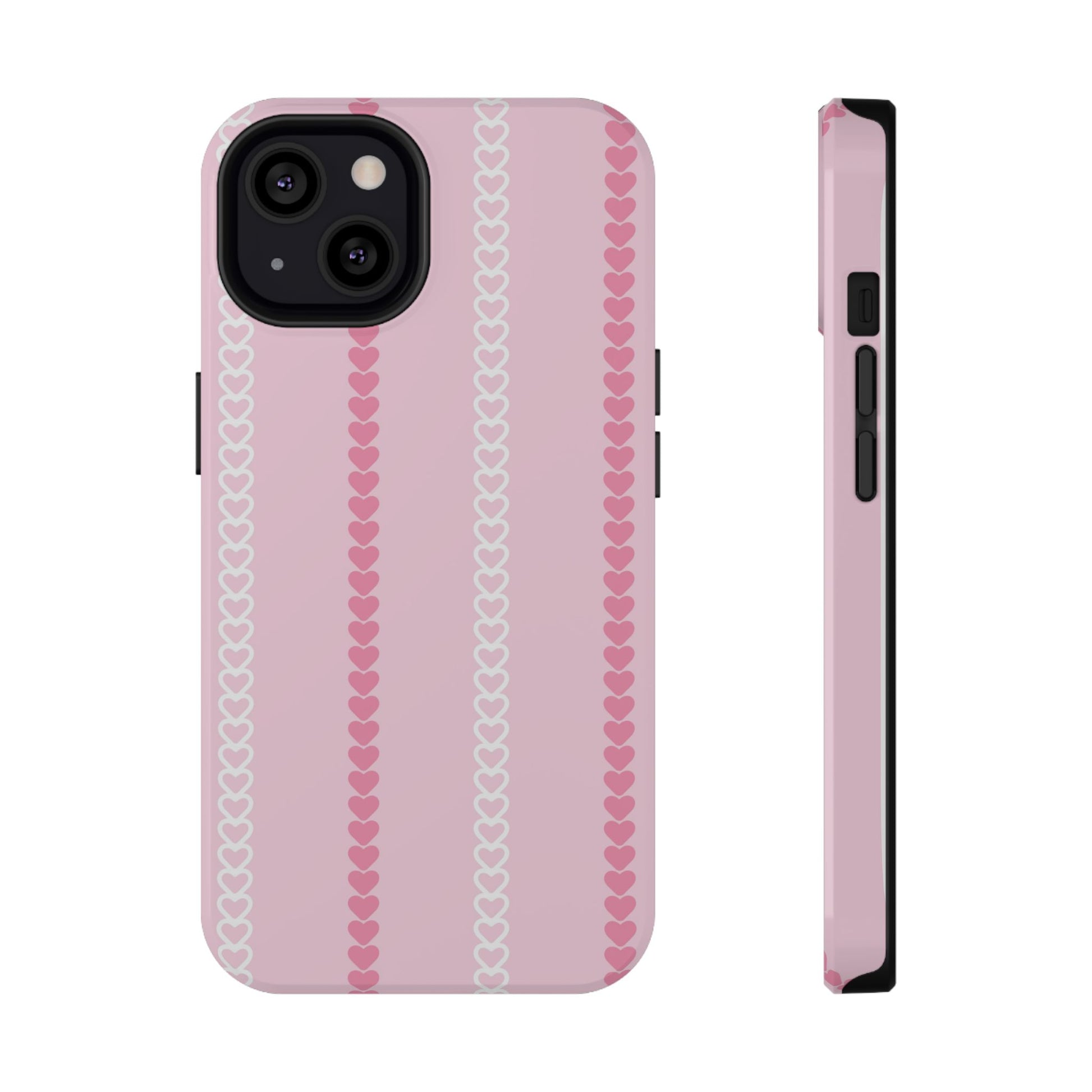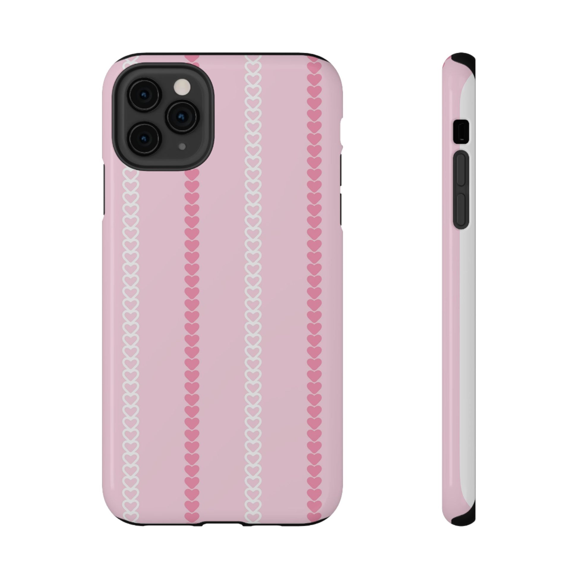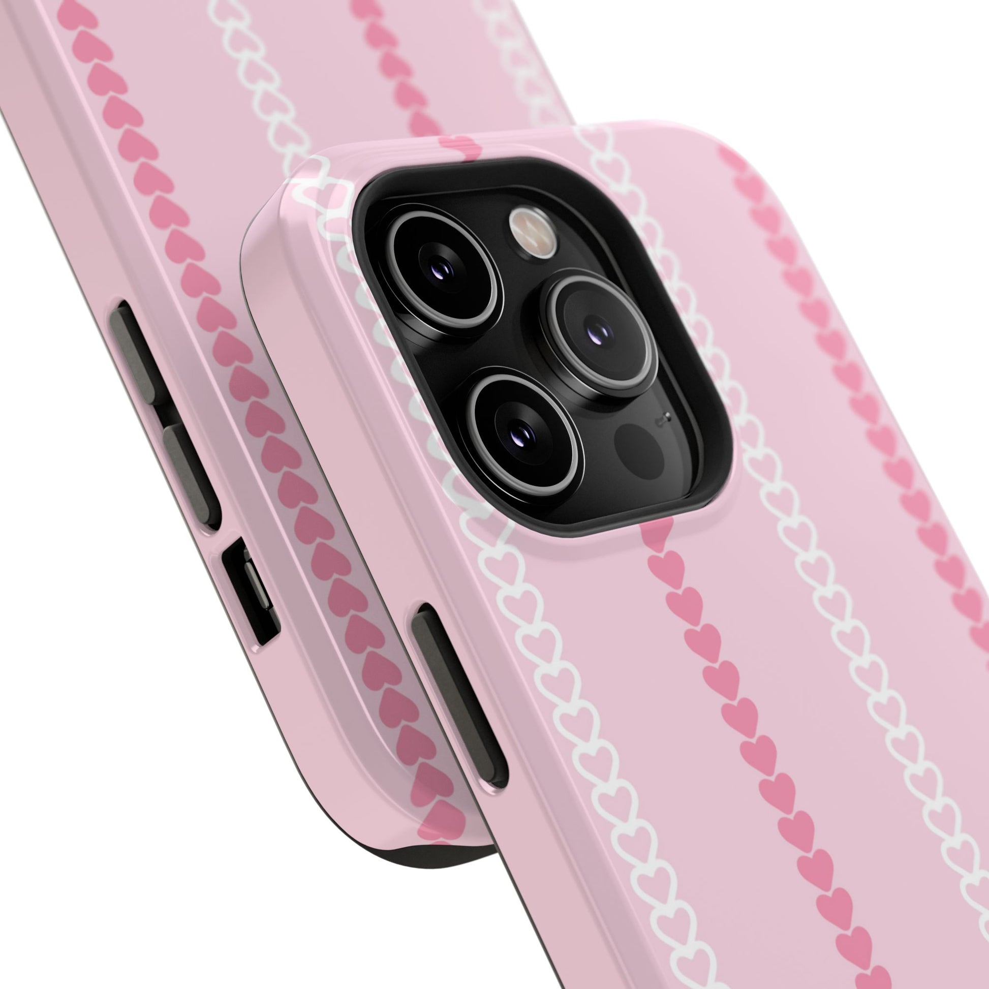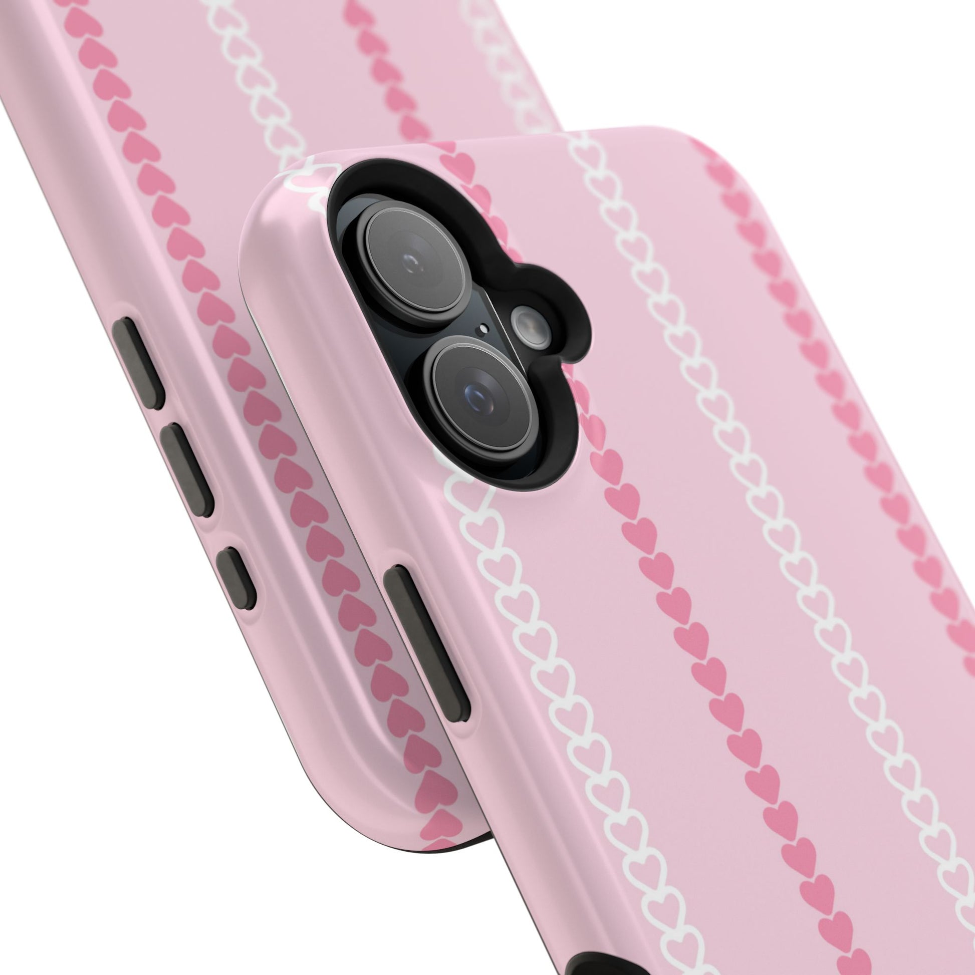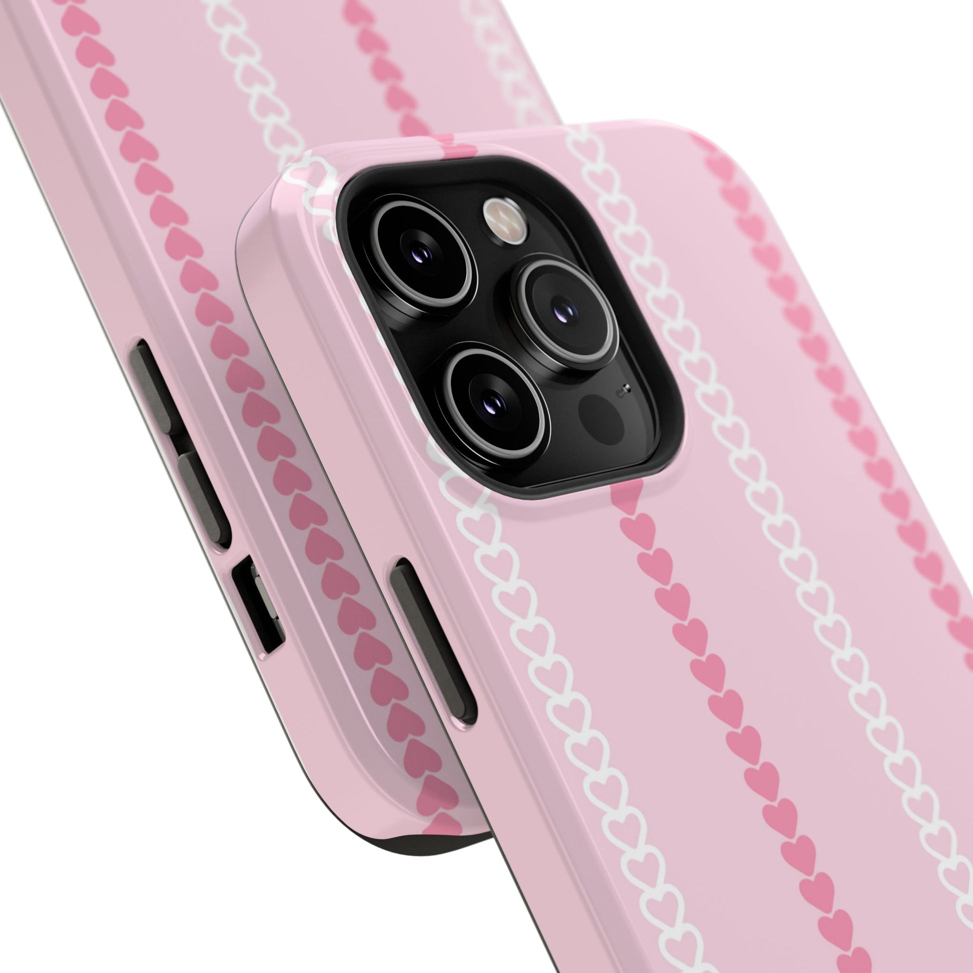 This slim, dual-layer phone case brings a soft, playful vibe to everyday carry. Pale pink stripes of tiny hearts and looping stitches wrap fully around the exterior, turning your phone into a subtle, sweet statement. The rigid polycarbonate outer shell and removable black TPU liner work together to absorb knocks and resist scratches while keeping the design sharp and glossy or gently muted in your choice of finish. It sits comfortably in hand, supports wireless charging, and fits new iPhone 17 series alongside other compatible models — a little everyday charm that protects without adding bulk.