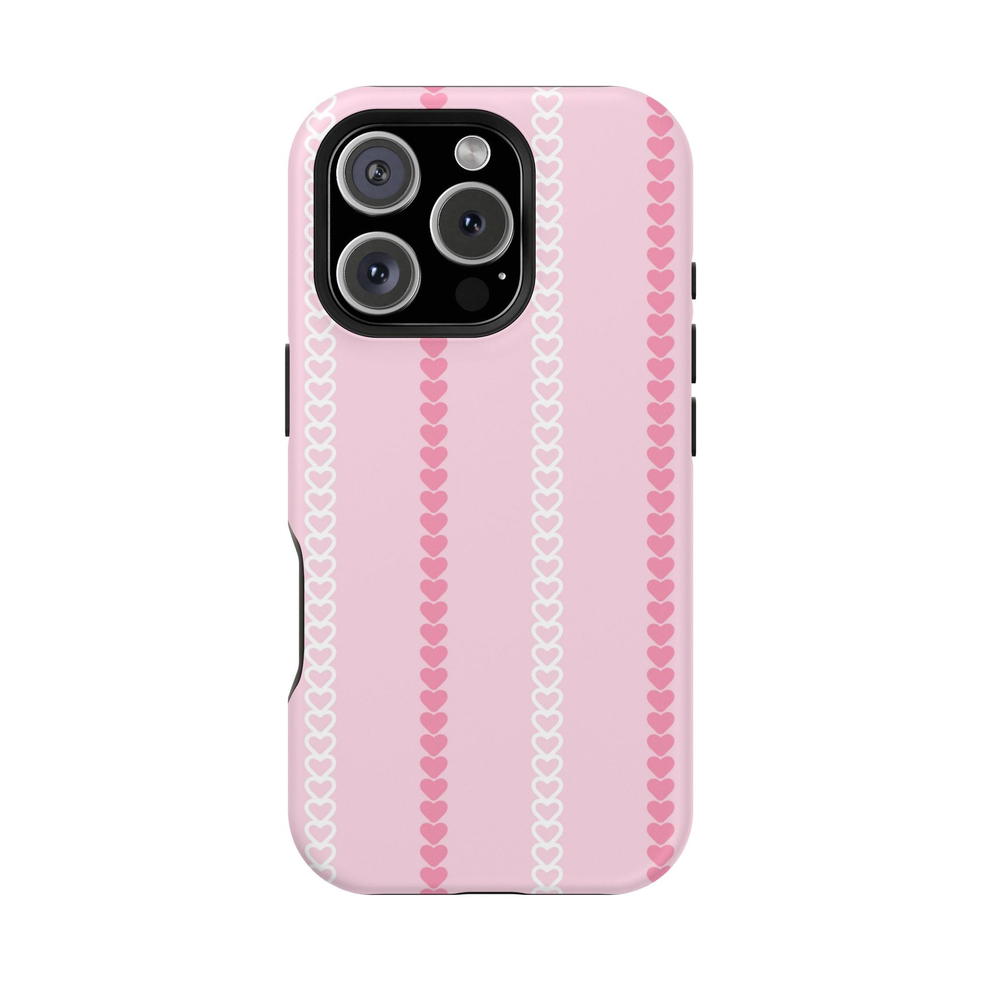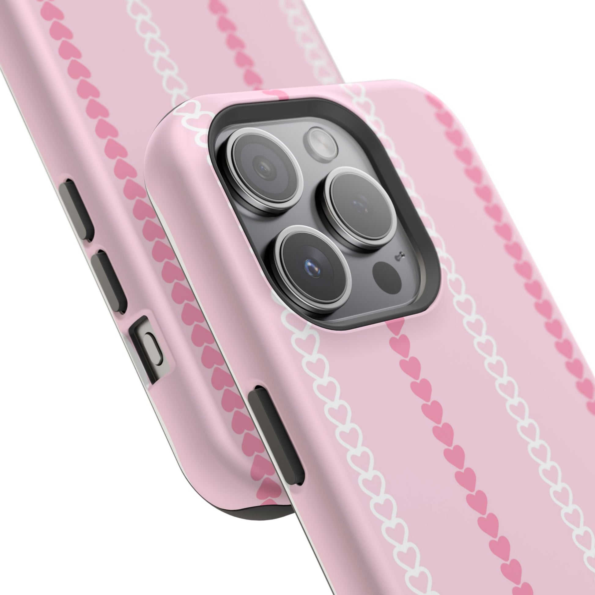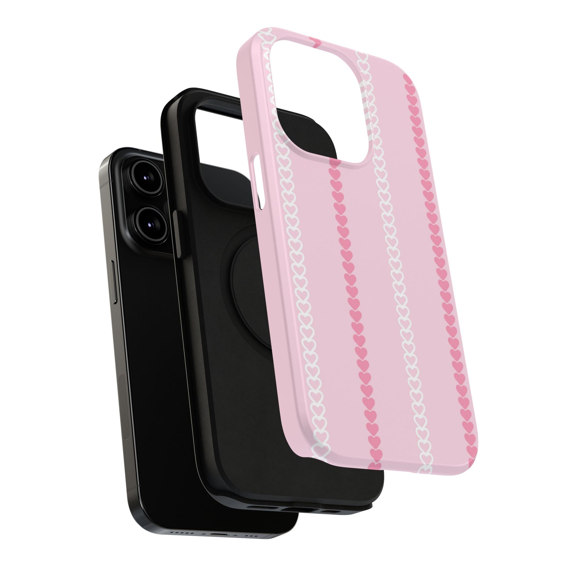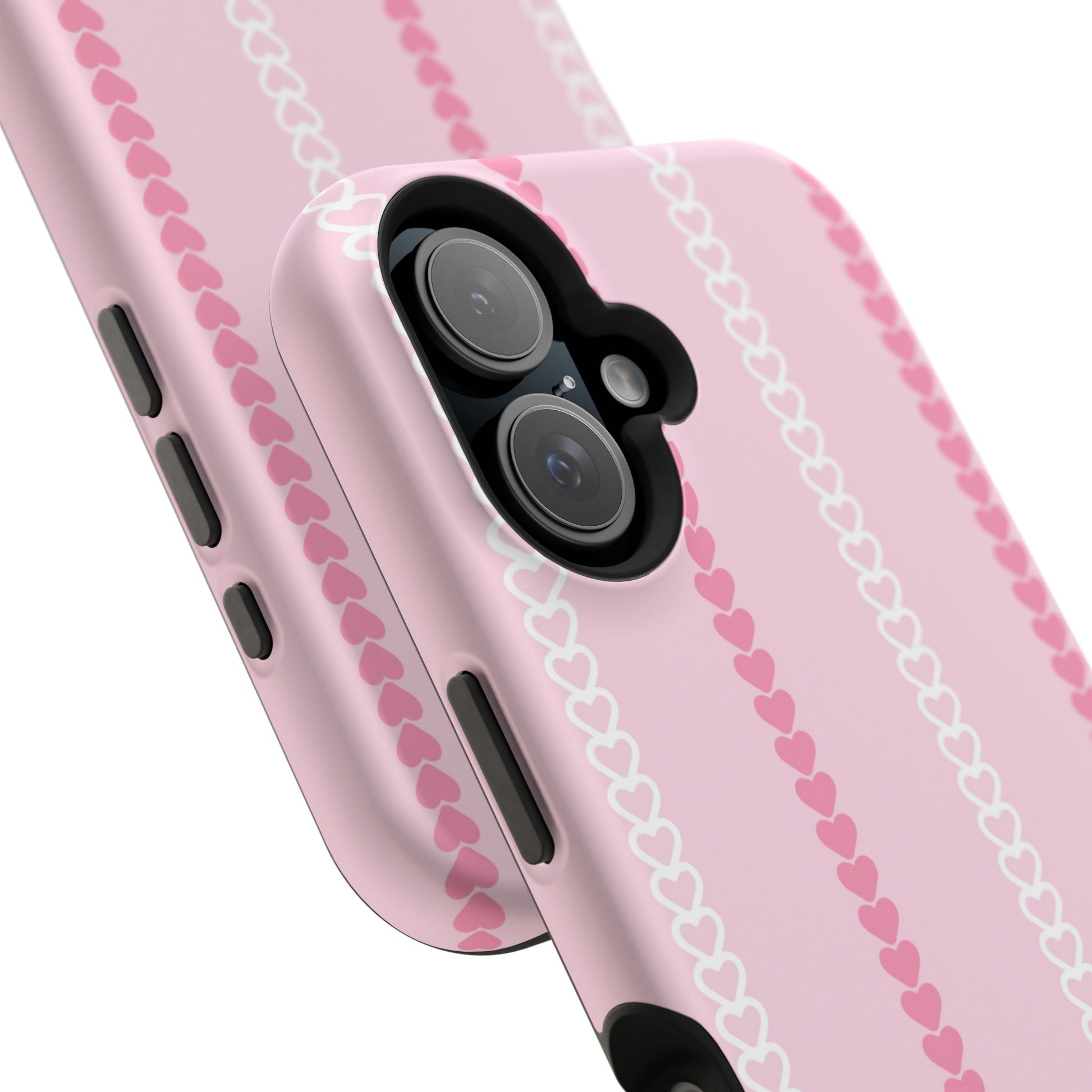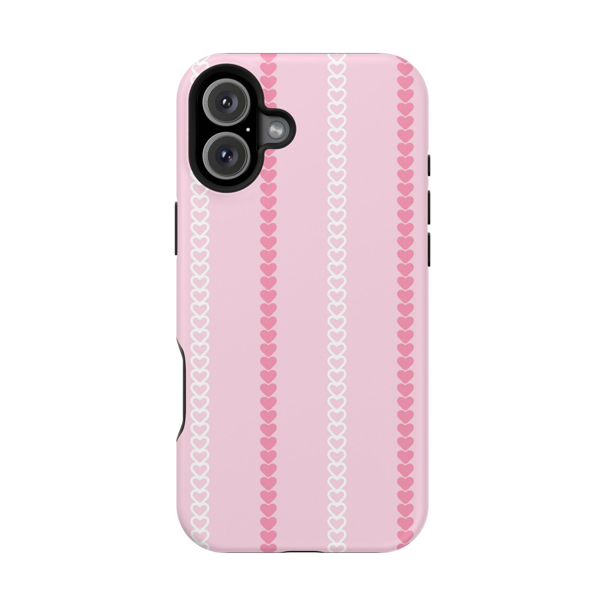 This slim, dual-layer phone case brings a soft, playful vibe to everyday carry. Pale pink stripes of tiny hearts and looping stitches wrap fully around the exterior, turning your phone into a subtle, sweet statement. The rigid polycarbonate outer shell and removable black TPU liner work together to absorb knocks and resist scratches while keeping the design sharp and glossy or gently muted in your choice of finish. It sits comfortably in hand, supports wireless charging, and fits new iPhone 17 series alongside other compatible models — a little everyday charm that protects without adding bulk.