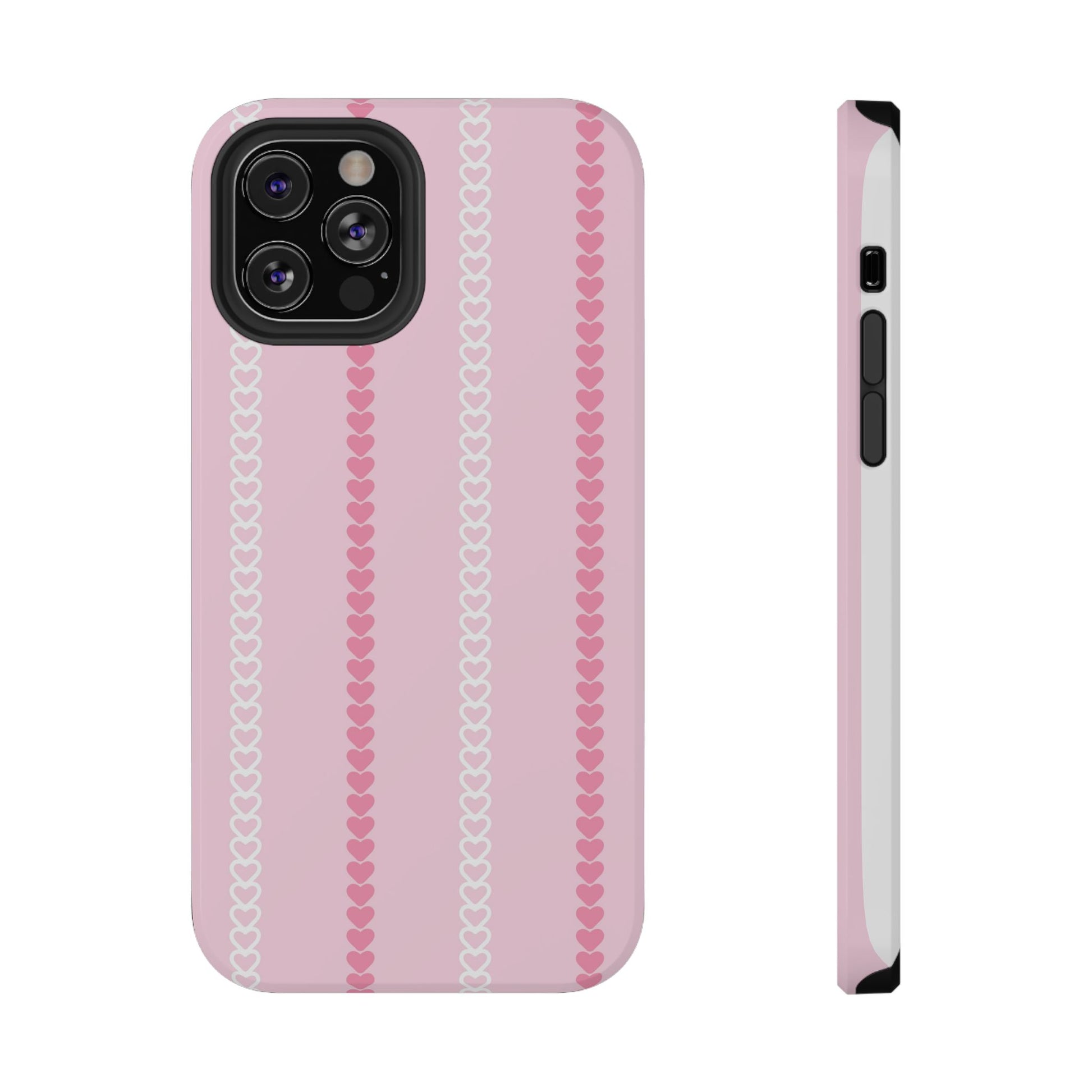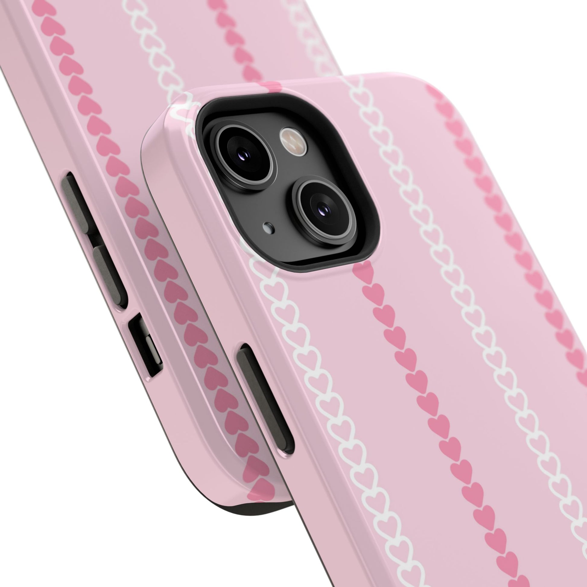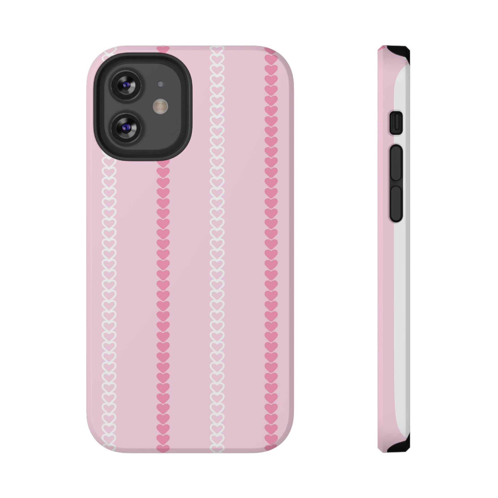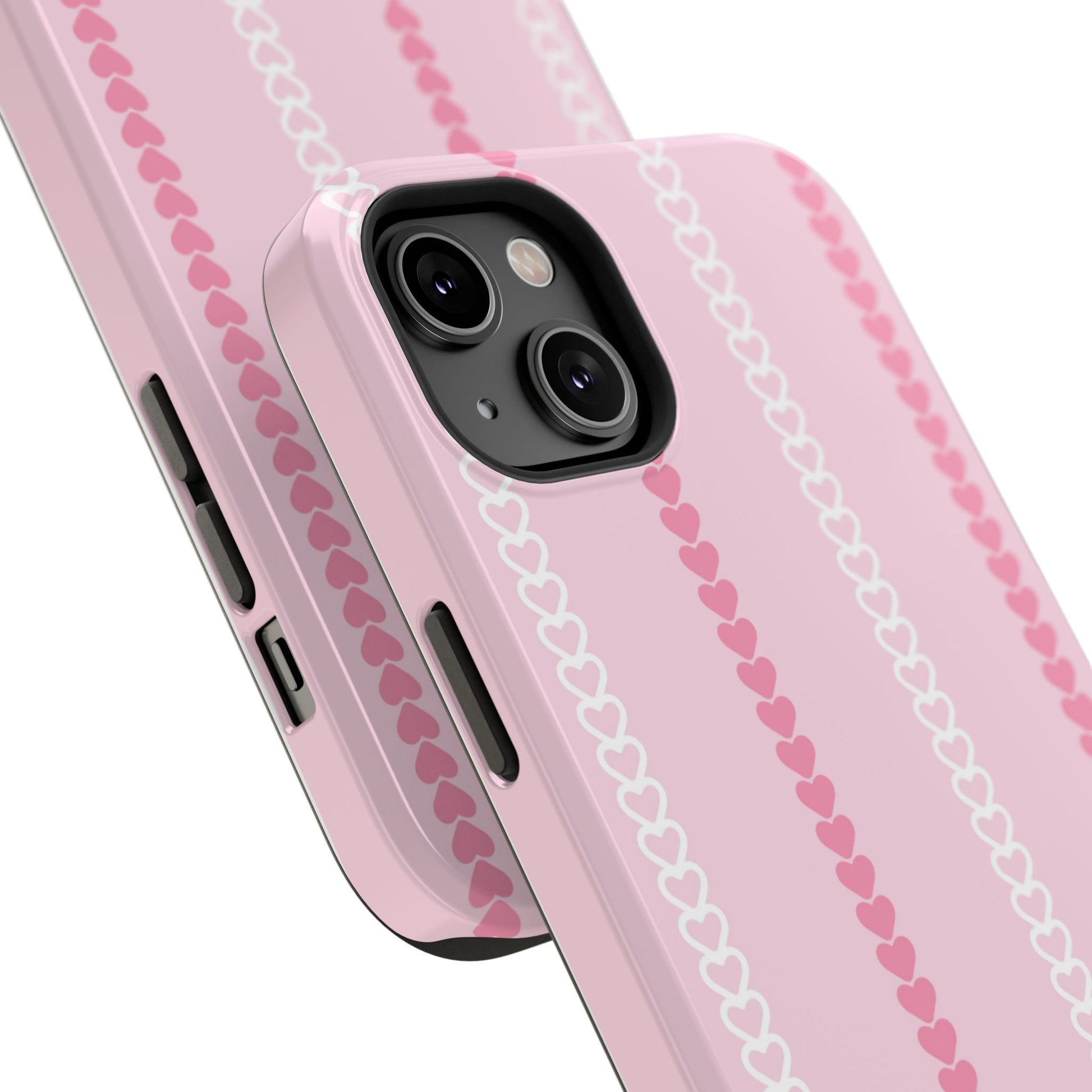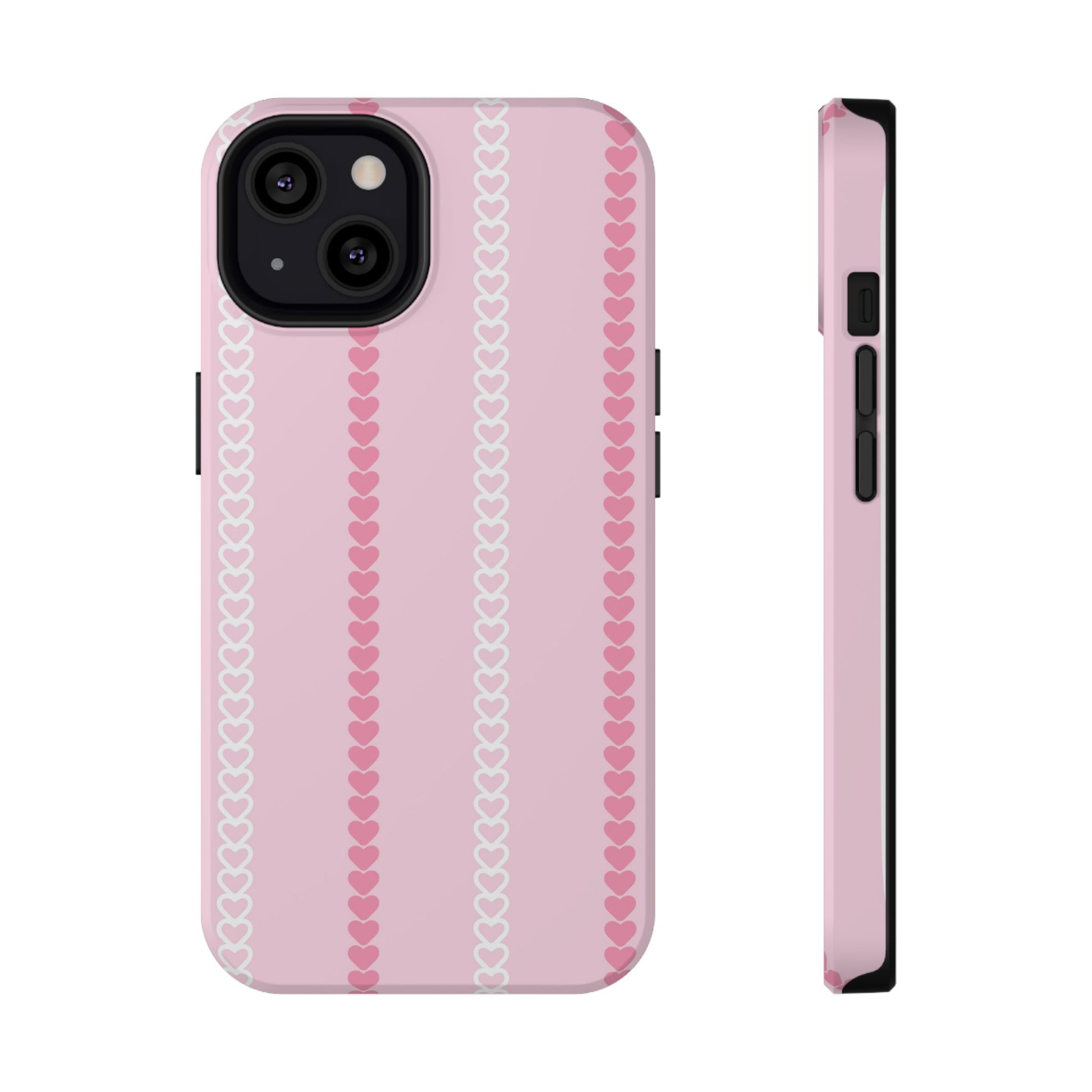 This slim, dual-layer phone case brings a soft, playful vibe to everyday carry. Pale pink stripes of tiny hearts and looping stitches wrap fully around the exterior, turning your phone into a subtle, sweet statement. The rigid polycarbonate outer shell and removable black TPU liner work together to absorb knocks and resist scratches while keeping the design sharp and glossy or gently muted in your choice of finish. It sits comfortably in hand, supports wireless charging, and fits new iPhone 17 series alongside other compatible models — a little everyday charm that protects without adding bulk.