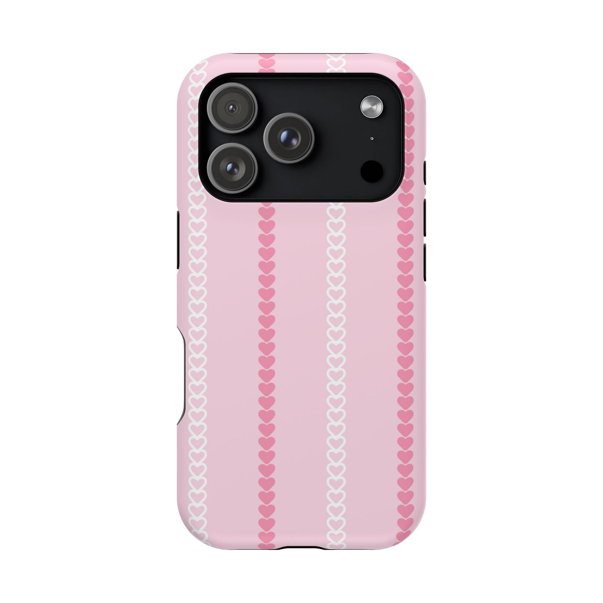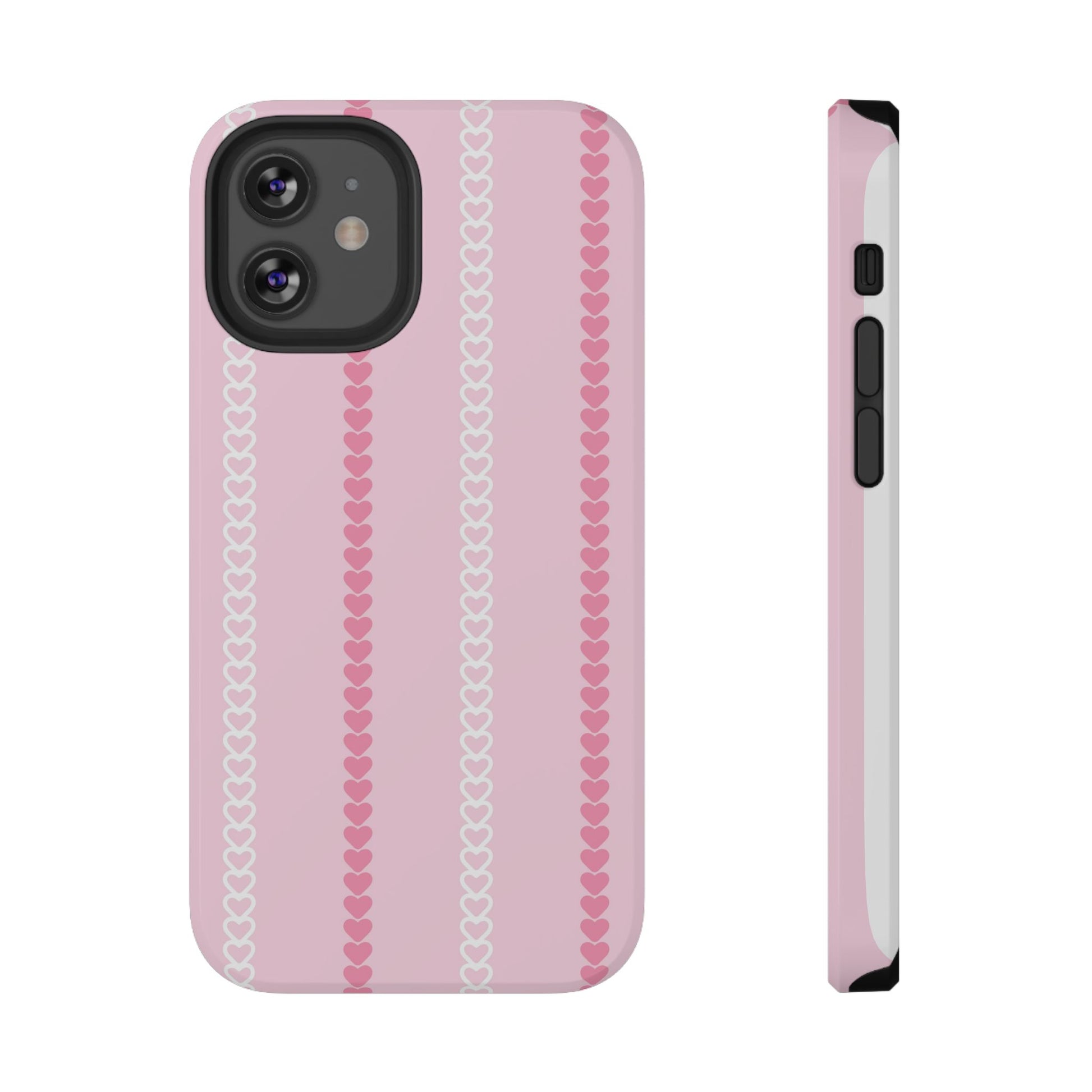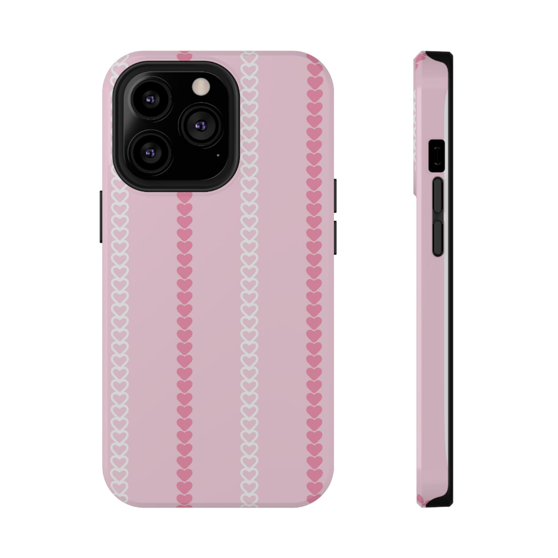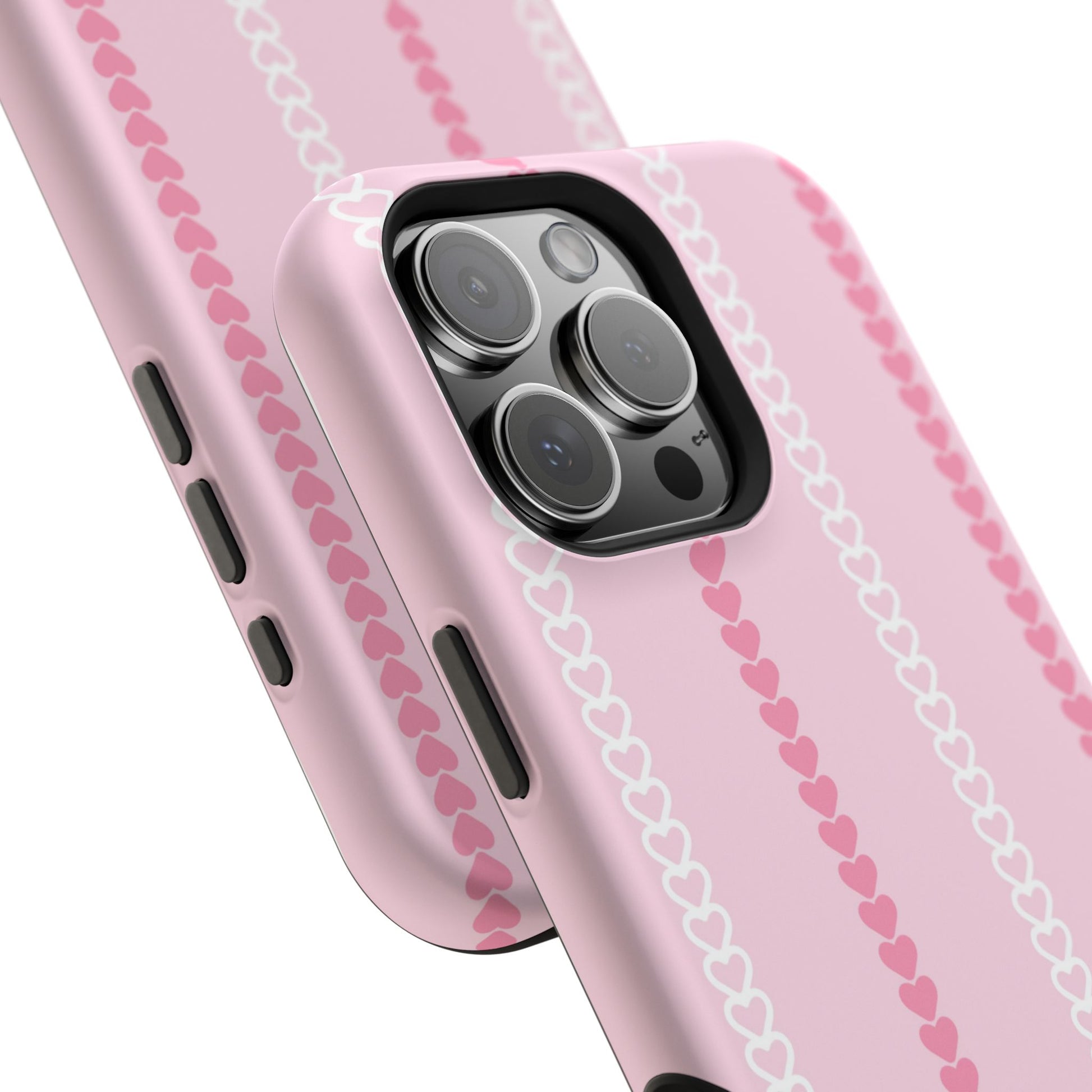 This slim, dual-layer phone case brings a soft, playful vibe to everyday carry. Pale pink stripes of tiny hearts and looping stitches wrap fully around the exterior, turning your phone into a subtle, sweet statement. The rigid polycarbonate outer shell and removable black TPU liner work together to absorb knocks and resist scratches while keeping the design sharp and glossy or gently muted in your choice of finish. It sits comfortably in hand, supports wireless charging, and fits new iPhone 17 series alongside other compatible models — a little everyday charm that protects without adding bulk.