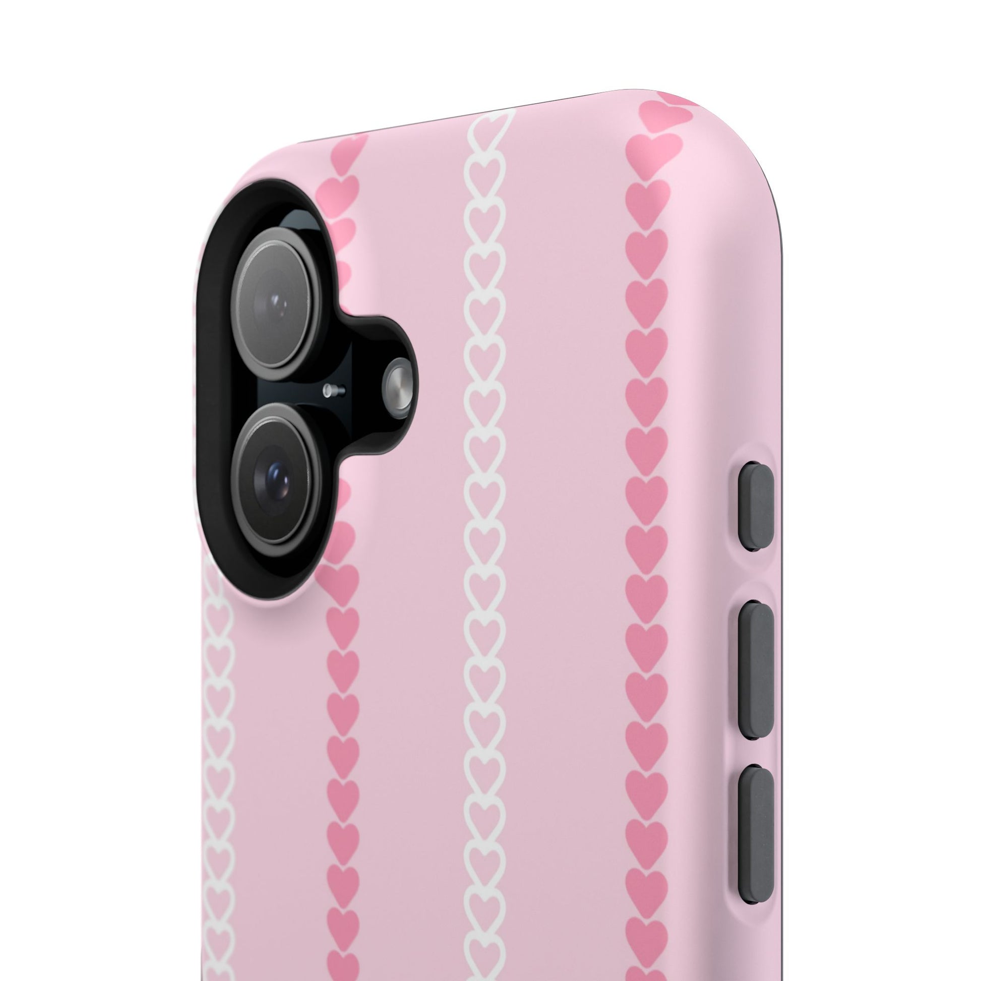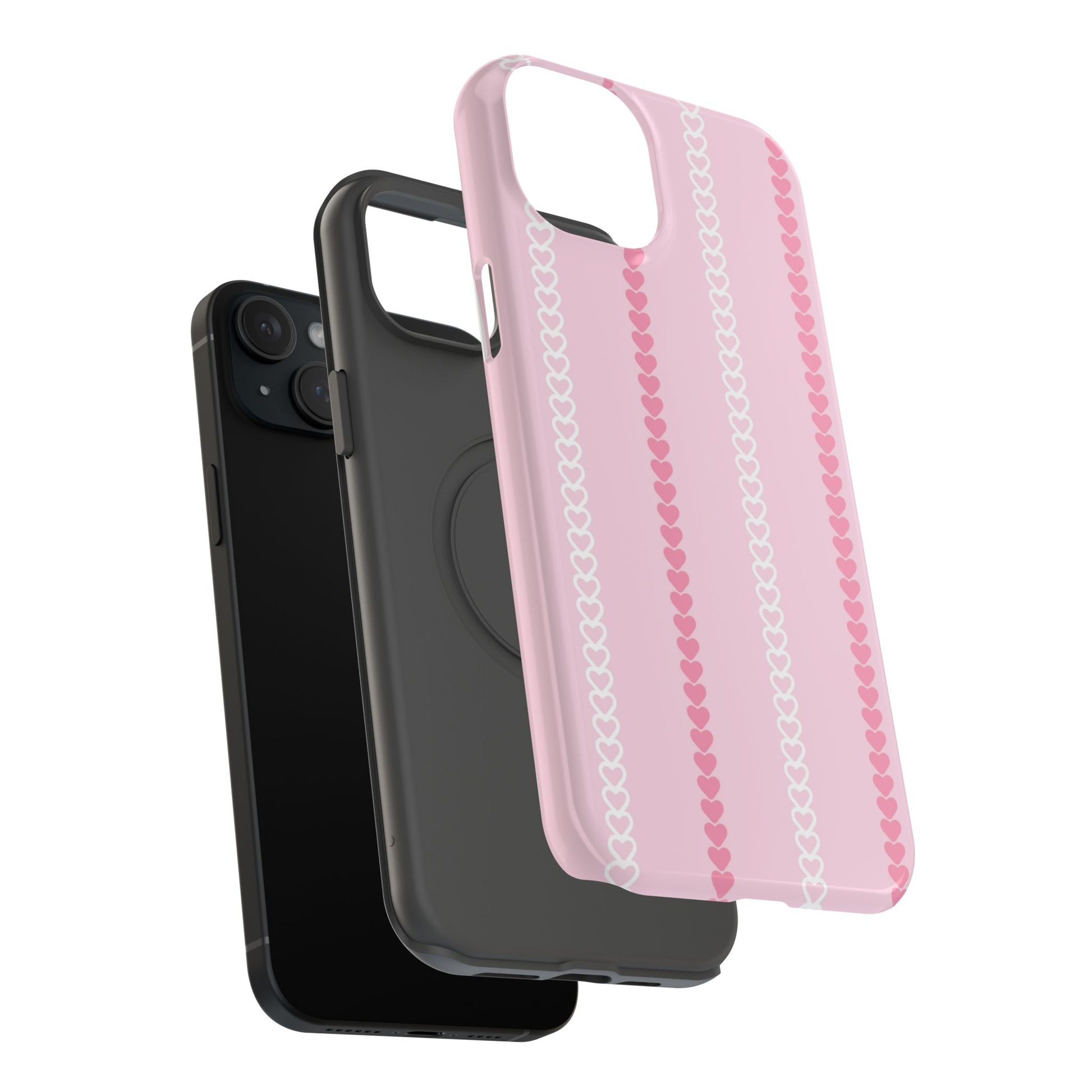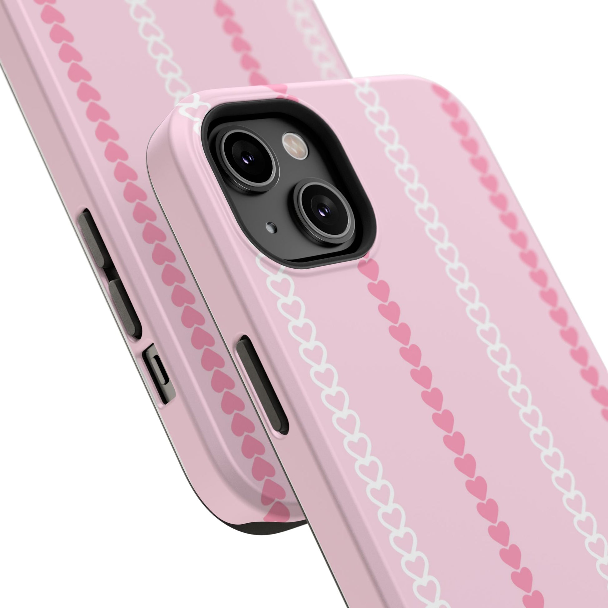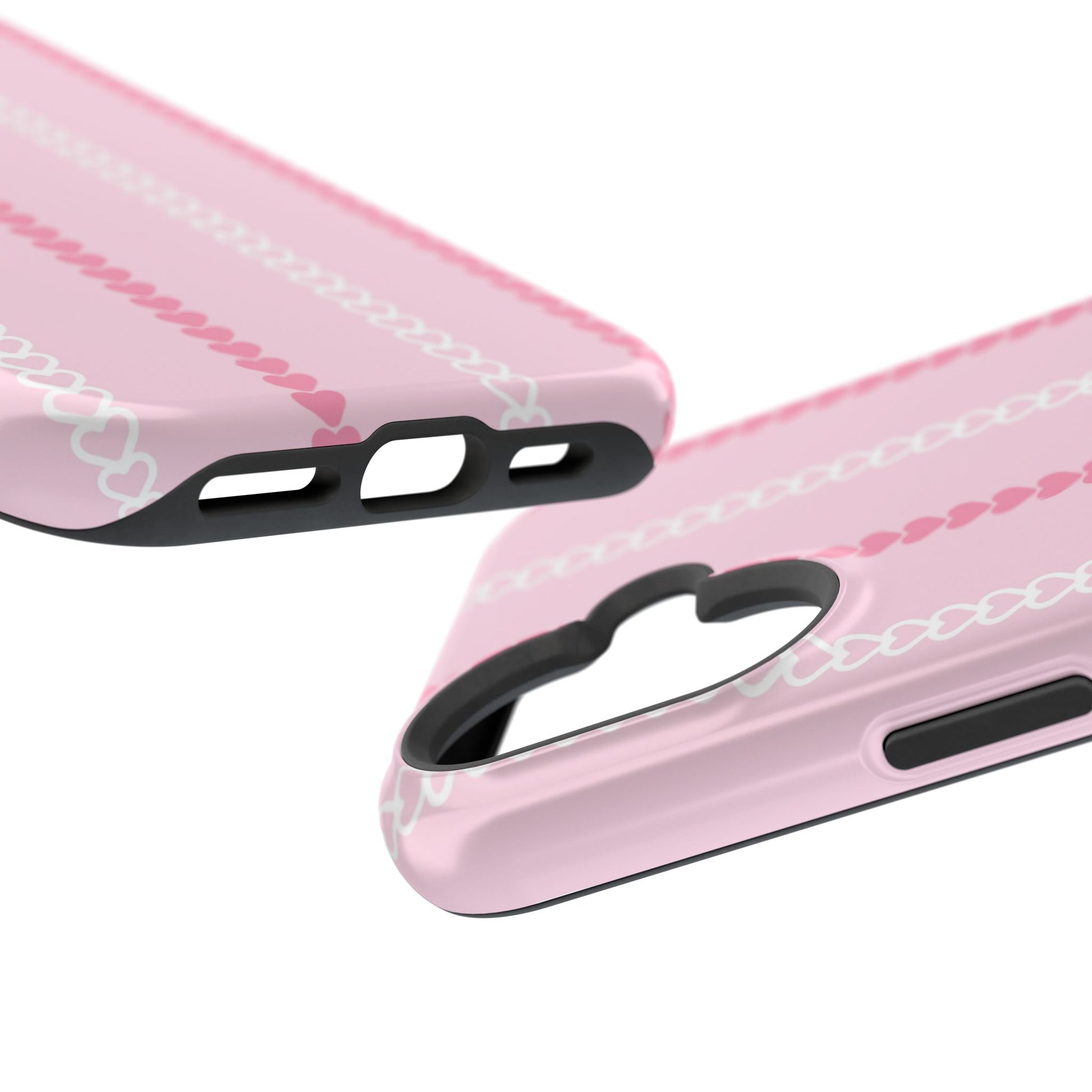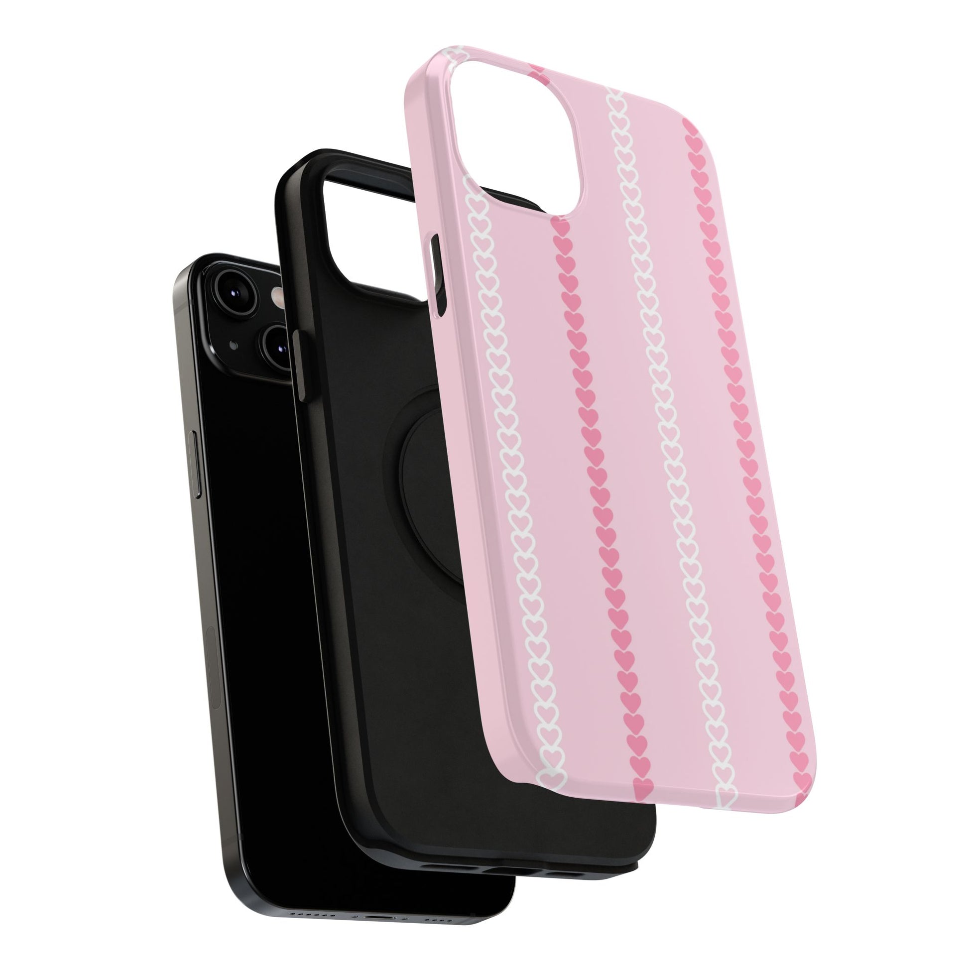 This slim, dual-layer phone case brings a soft, playful vibe to everyday carry. Pale pink stripes of tiny hearts and looping stitches wrap fully around the exterior, turning your phone into a subtle, sweet statement. The rigid polycarbonate outer shell and removable black TPU liner work together to absorb knocks and resist scratches while keeping the design sharp and glossy or gently muted in your choice of finish. It sits comfortably in hand, supports wireless charging, and fits new iPhone 17 series alongside other compatible models — a little everyday charm that protects without adding bulk.