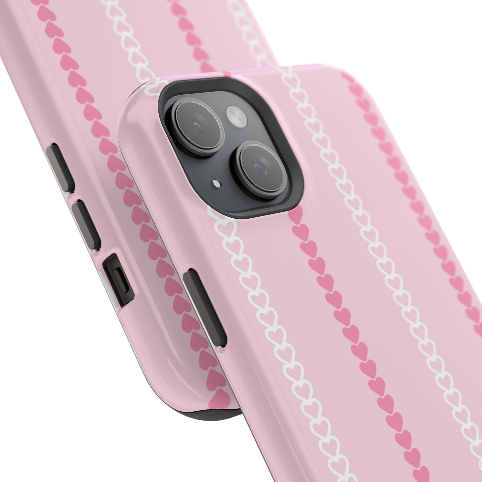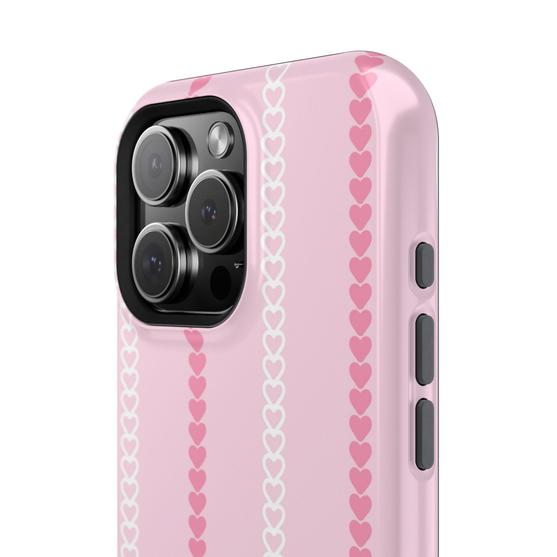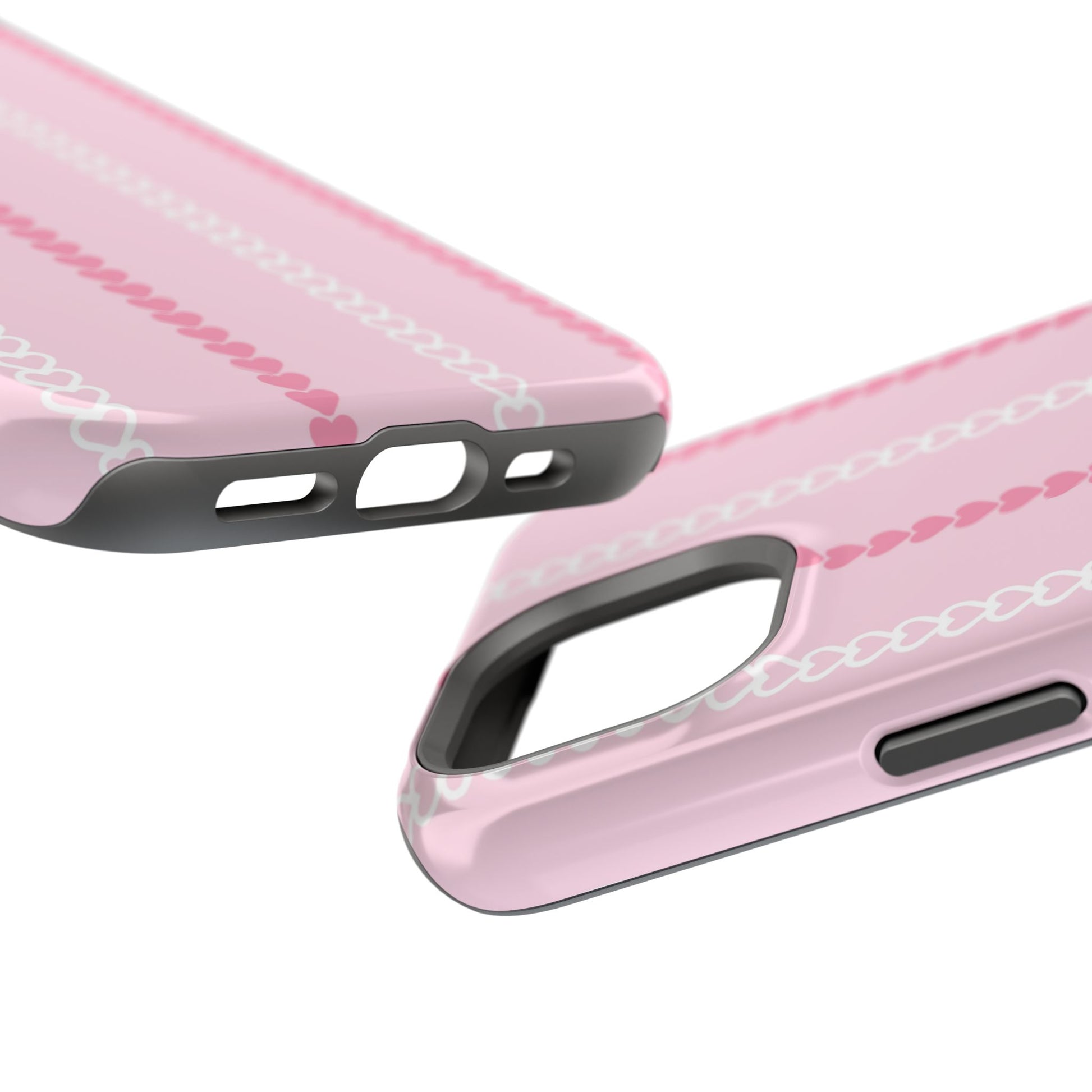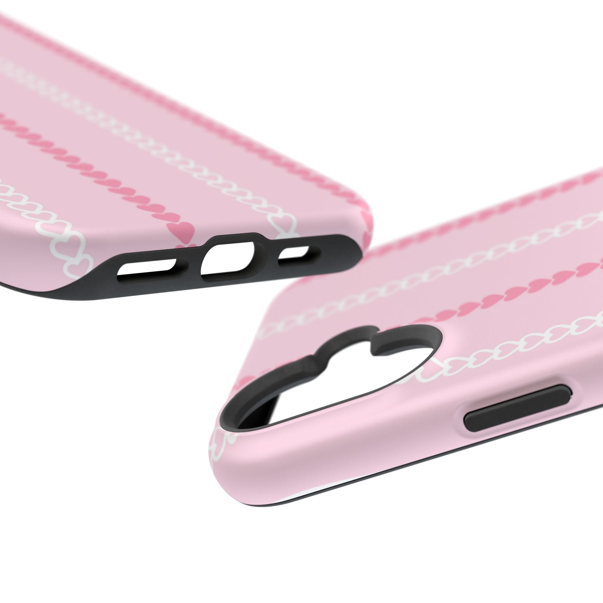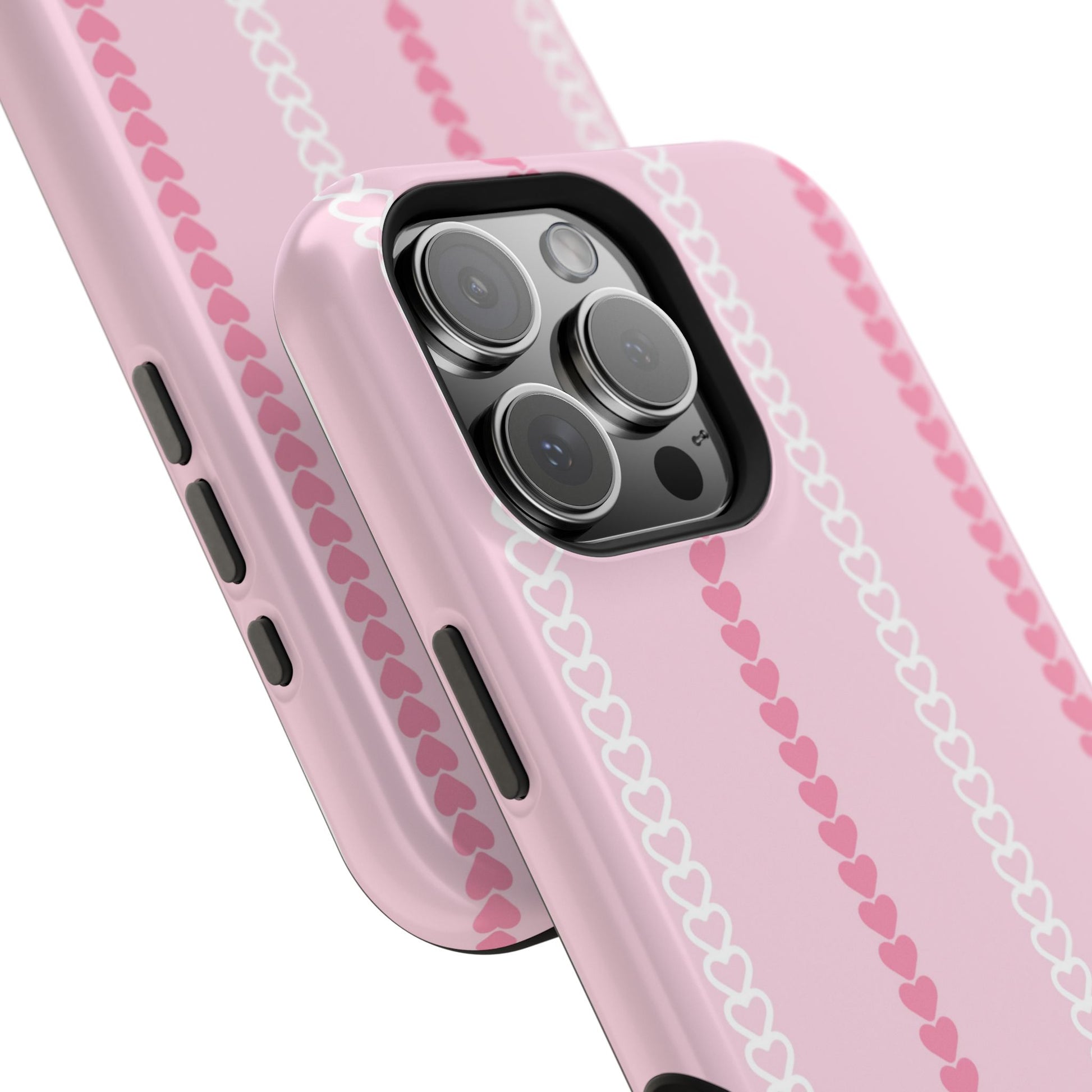 This slim, dual-layer phone case brings a soft, playful vibe to everyday carry. Pale pink stripes of tiny hearts and looping stitches wrap fully around the exterior, turning your phone into a subtle, sweet statement. The rigid polycarbonate outer shell and removable black TPU liner work together to absorb knocks and resist scratches while keeping the design sharp and glossy or gently muted in your choice of finish. It sits comfortably in hand, supports wireless charging, and fits new iPhone 17 series alongside other compatible models — a little everyday charm that protects without adding bulk.