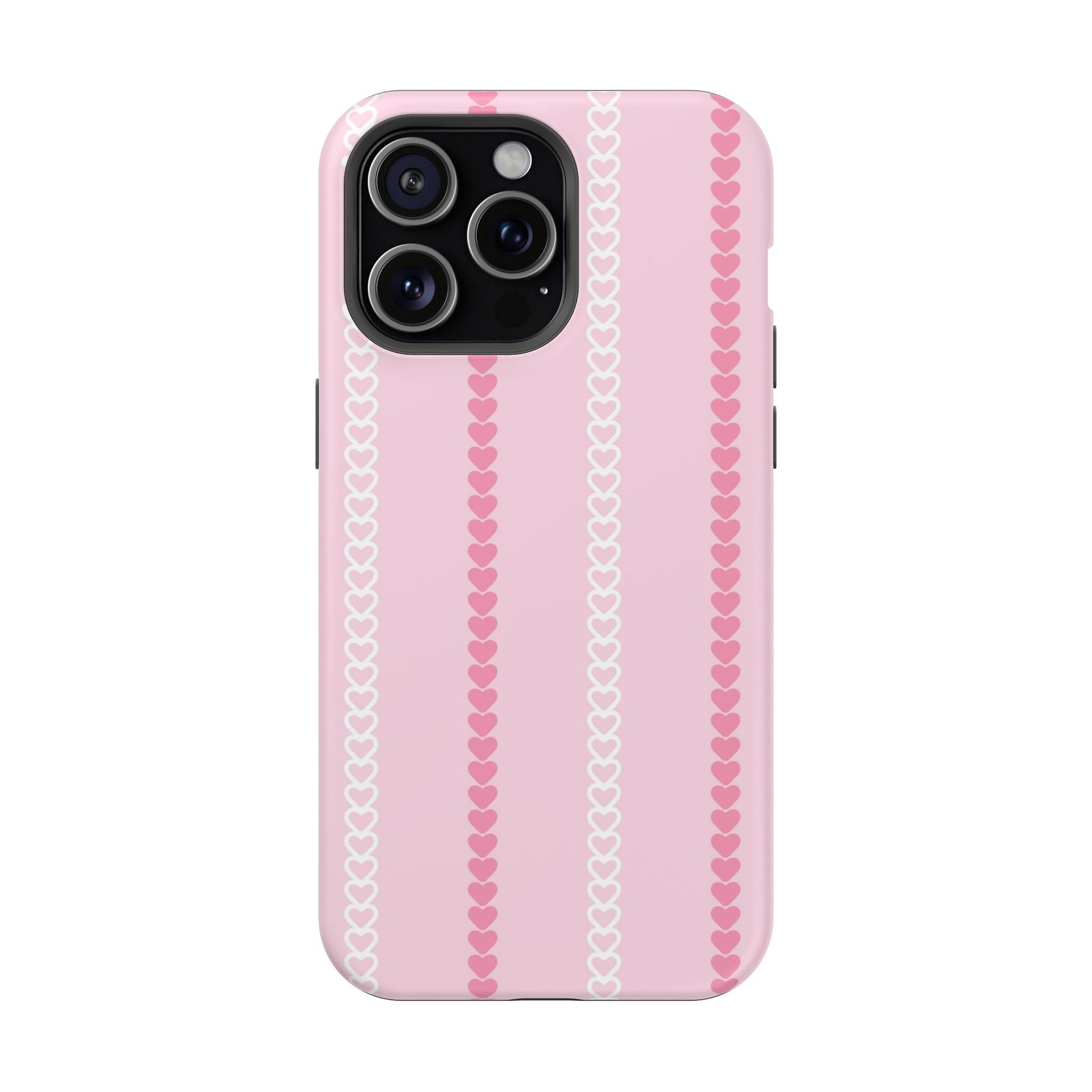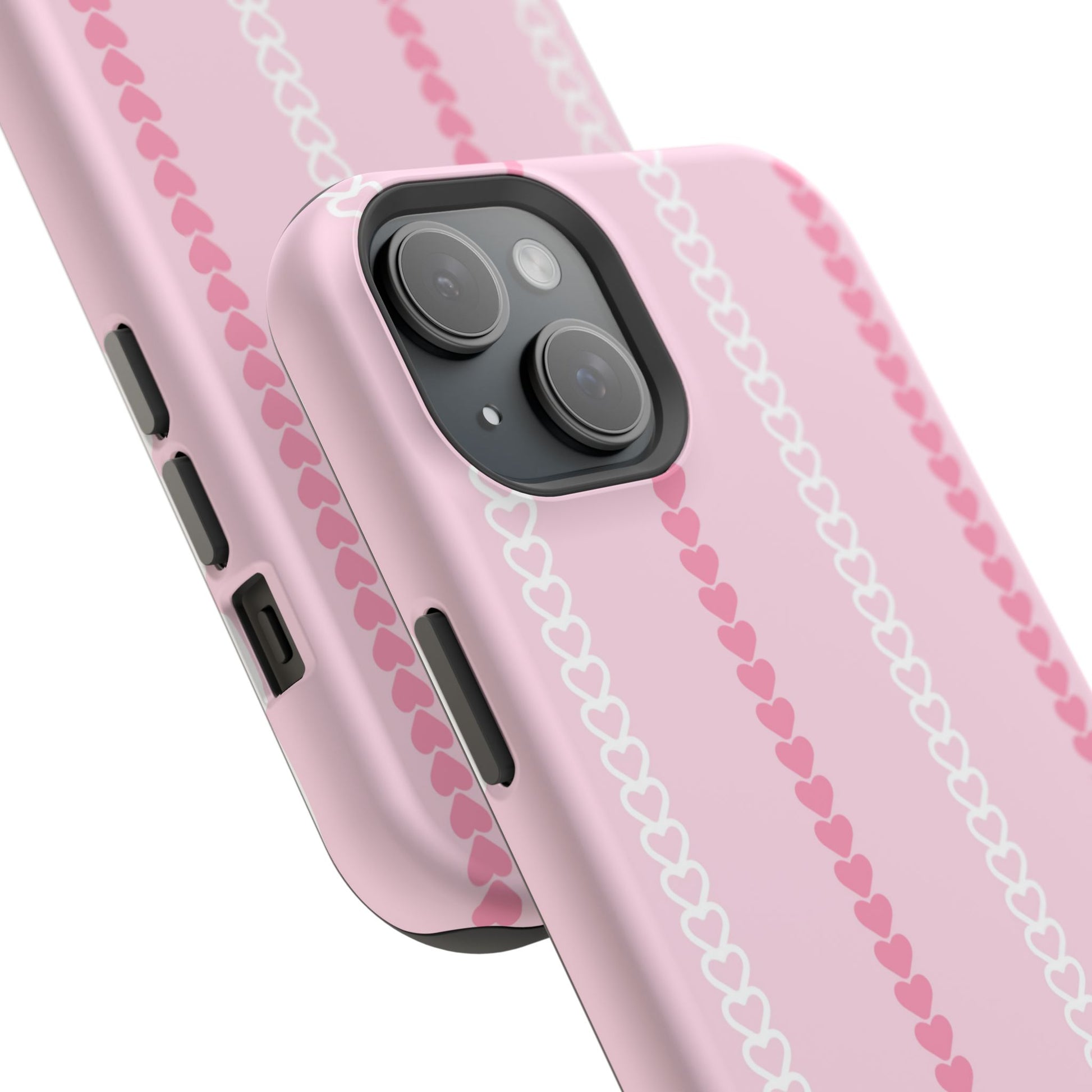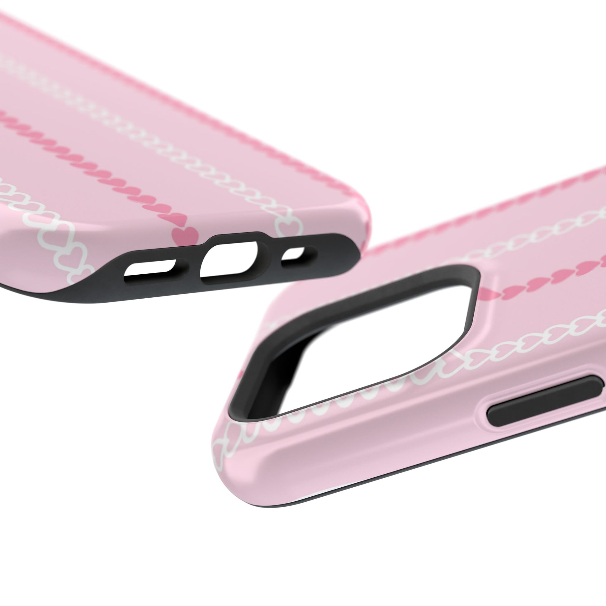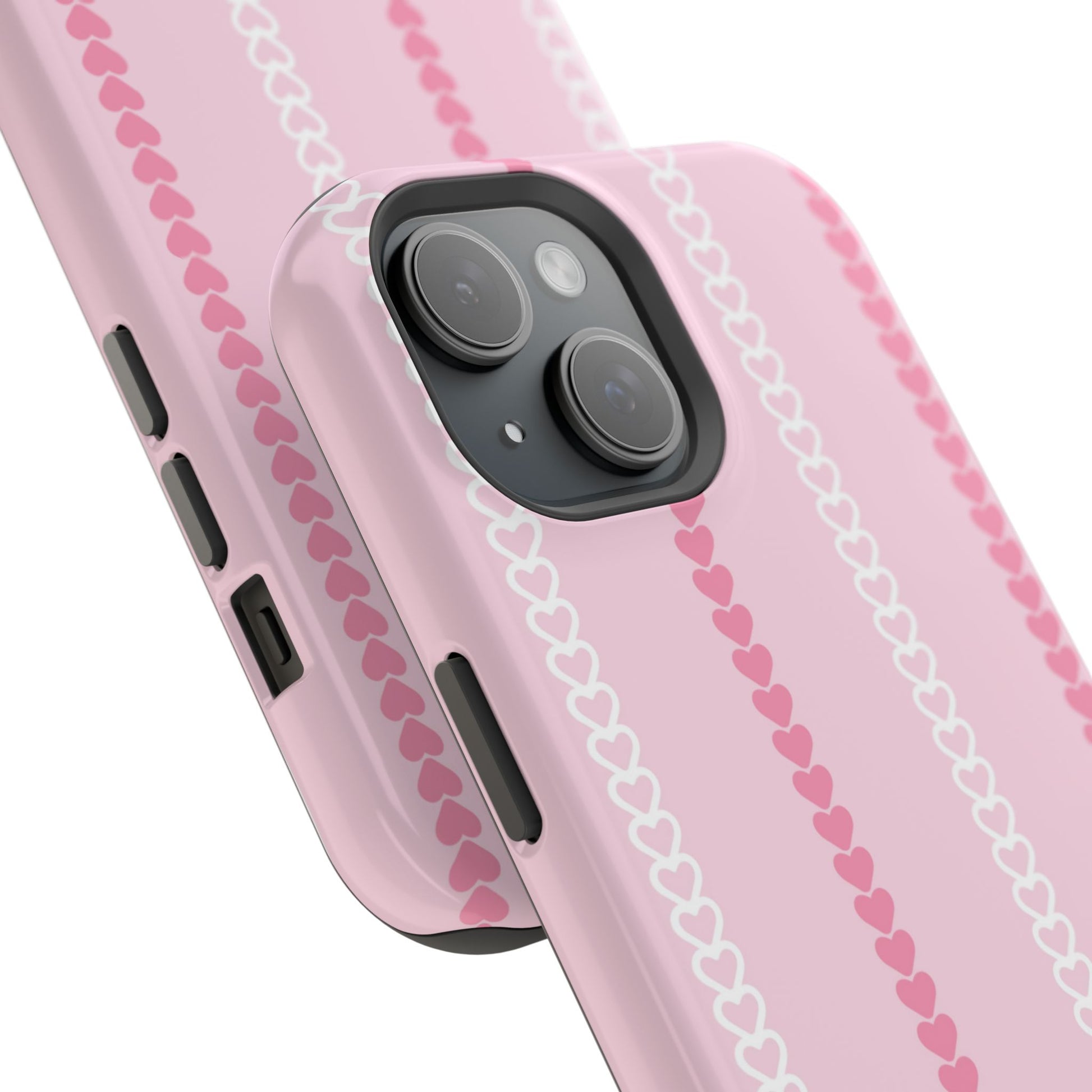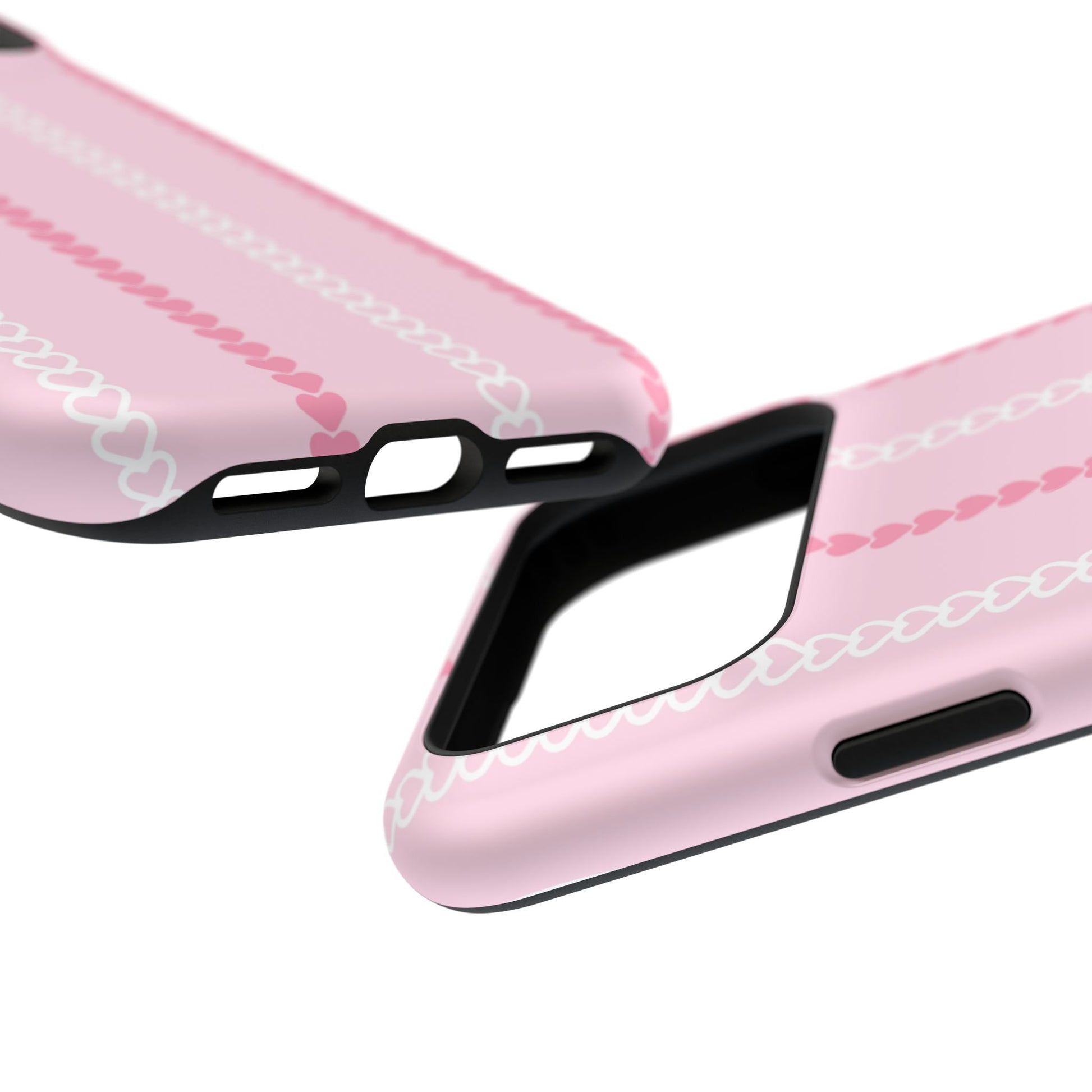 This slim, dual-layer phone case brings a soft, playful vibe to everyday carry. Pale pink stripes of tiny hearts and looping stitches wrap fully around the exterior, turning your phone into a subtle, sweet statement. The rigid polycarbonate outer shell and removable black TPU liner work together to absorb knocks and resist scratches while keeping the design sharp and glossy or gently muted in your choice of finish. It sits comfortably in hand, supports wireless charging, and fits new iPhone 17 series alongside other compatible models — a little everyday charm that protects without adding bulk.