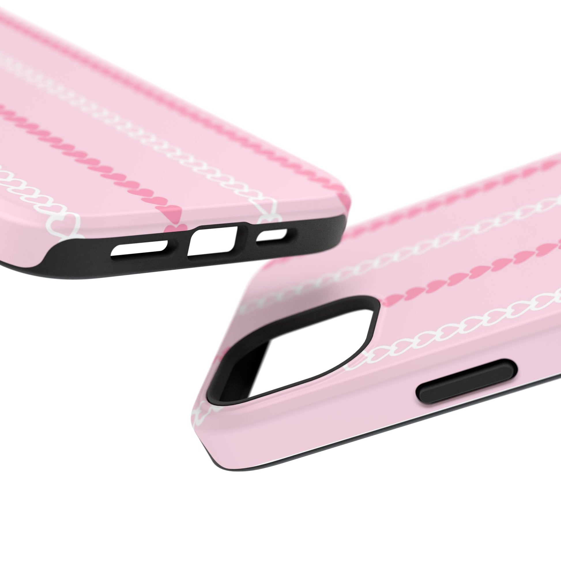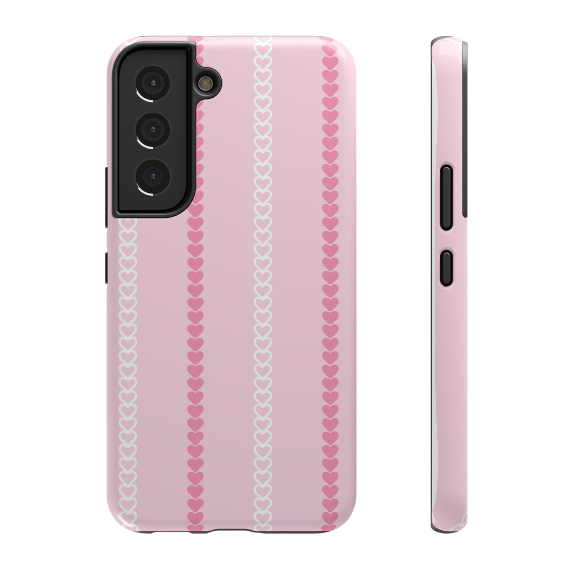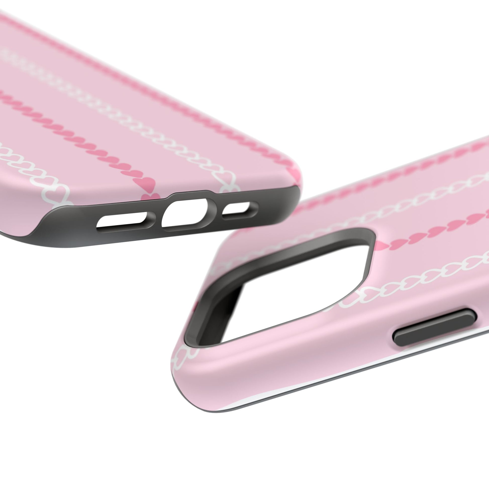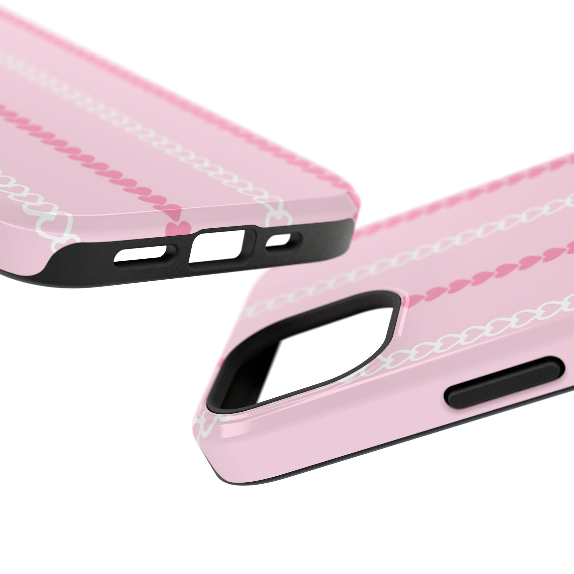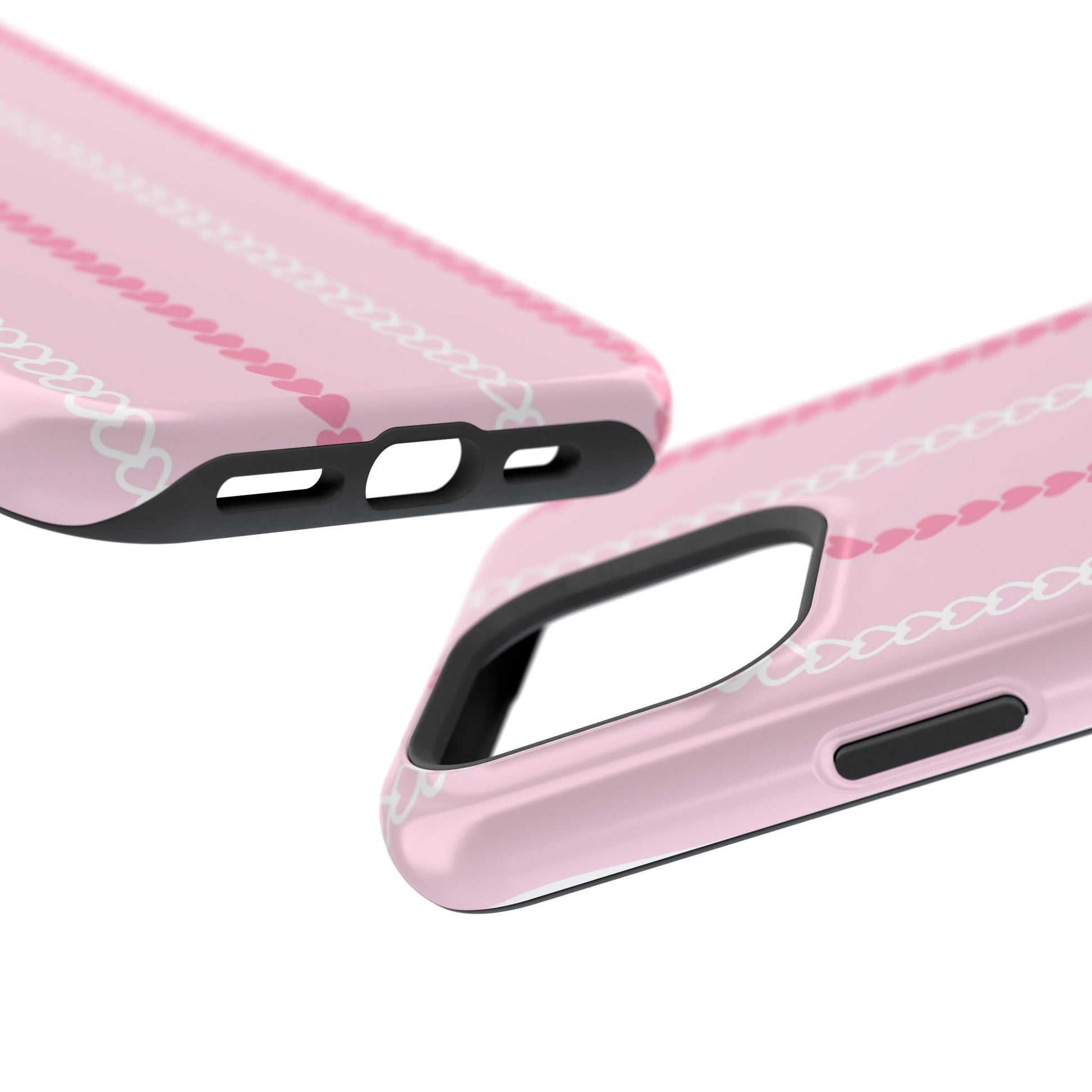 This slim, dual-layer phone case brings a soft, playful vibe to everyday carry. Pale pink stripes of tiny hearts and looping stitches wrap fully around the exterior, turning your phone into a subtle, sweet statement. The rigid polycarbonate outer shell and removable black TPU liner work together to absorb knocks and resist scratches while keeping the design sharp and glossy or gently muted in your choice of finish. It sits comfortably in hand, supports wireless charging, and fits new iPhone 17 series alongside other compatible models — a little everyday charm that protects without adding bulk.